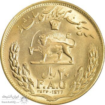 سکه 20 ریال 2536 فائو - گندم - طلایی - MS62 - محمد رضا شاه