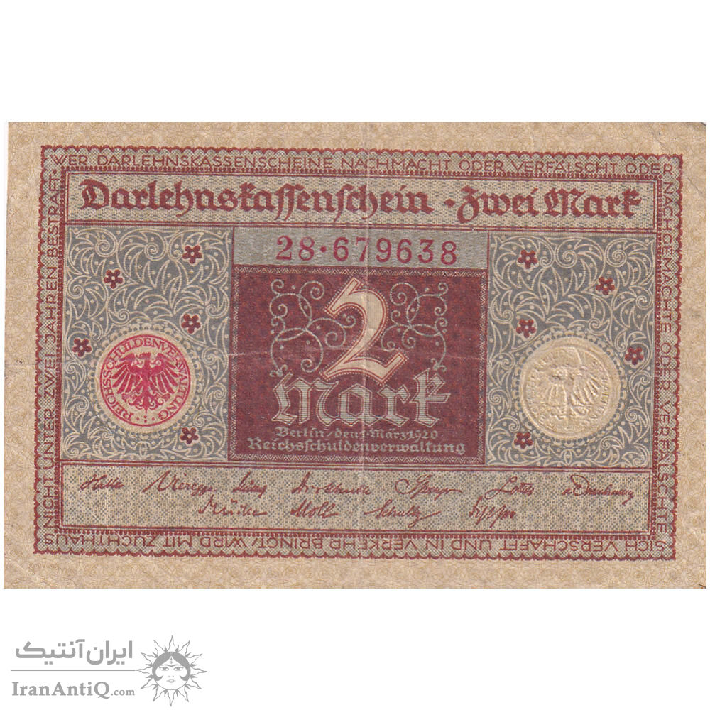 اسکناس 2 مارک 1920 جمهوری وایمار - تک - VF - آلمان