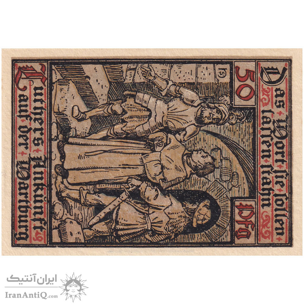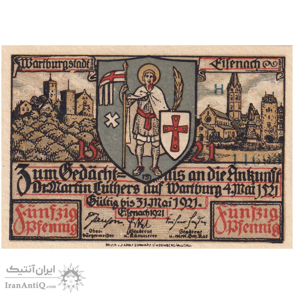 اسکناس 50 فینیگ 1921 جمهوری وایمار - با حرف H - آیزناخ - تک - UNC62 - آلمان
