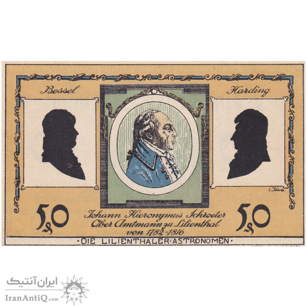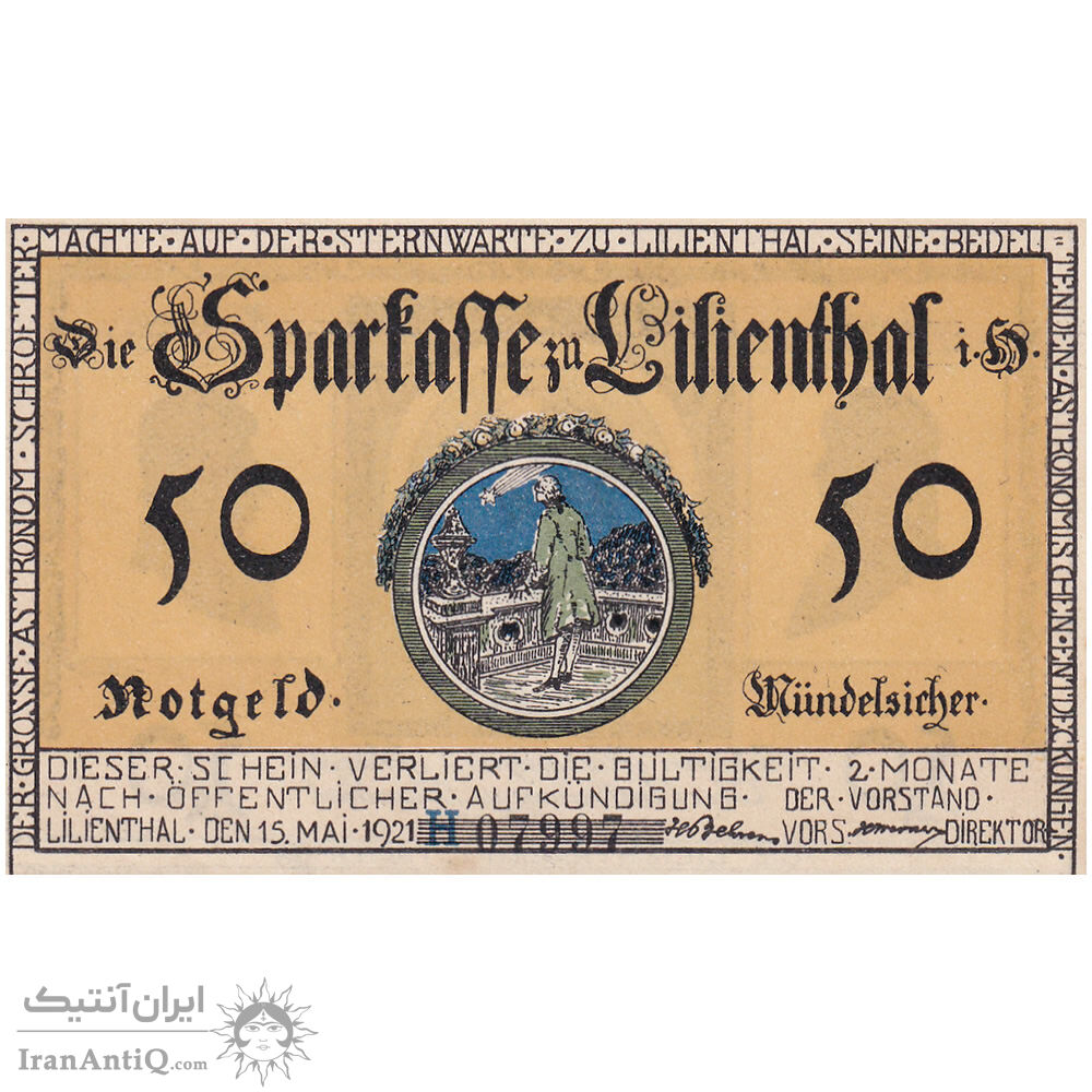 اسکناس 50 فینیگ 1921 جمهوری وایمار - لیلینتال - تک - UNC62 - آلمان