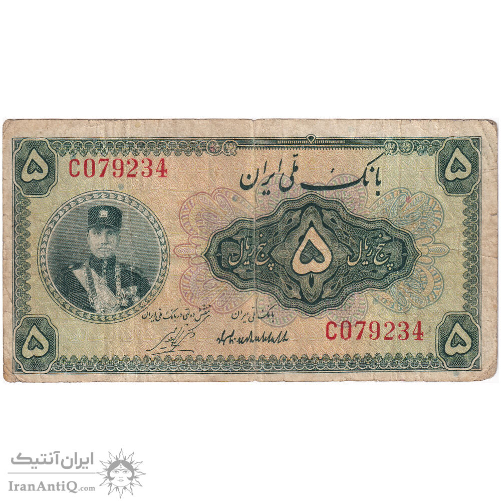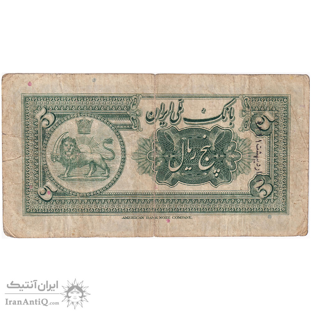 اسکناس 5 ریال کلاه کوچک - تک - VF20 - رضا شاه