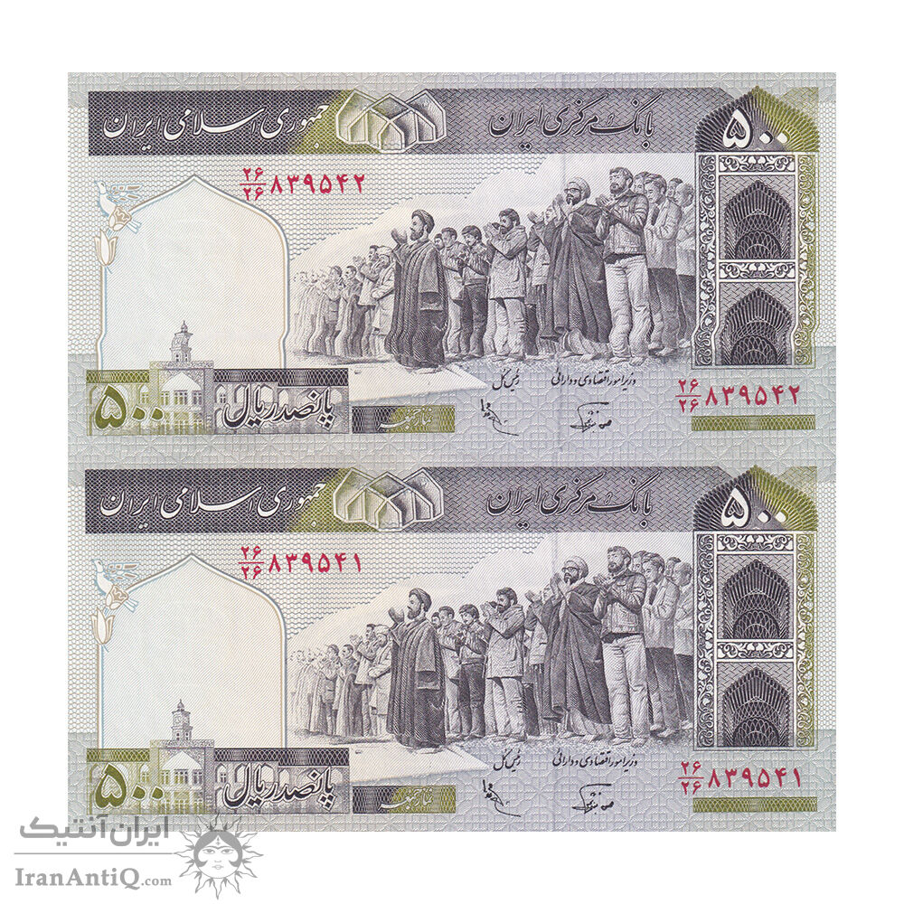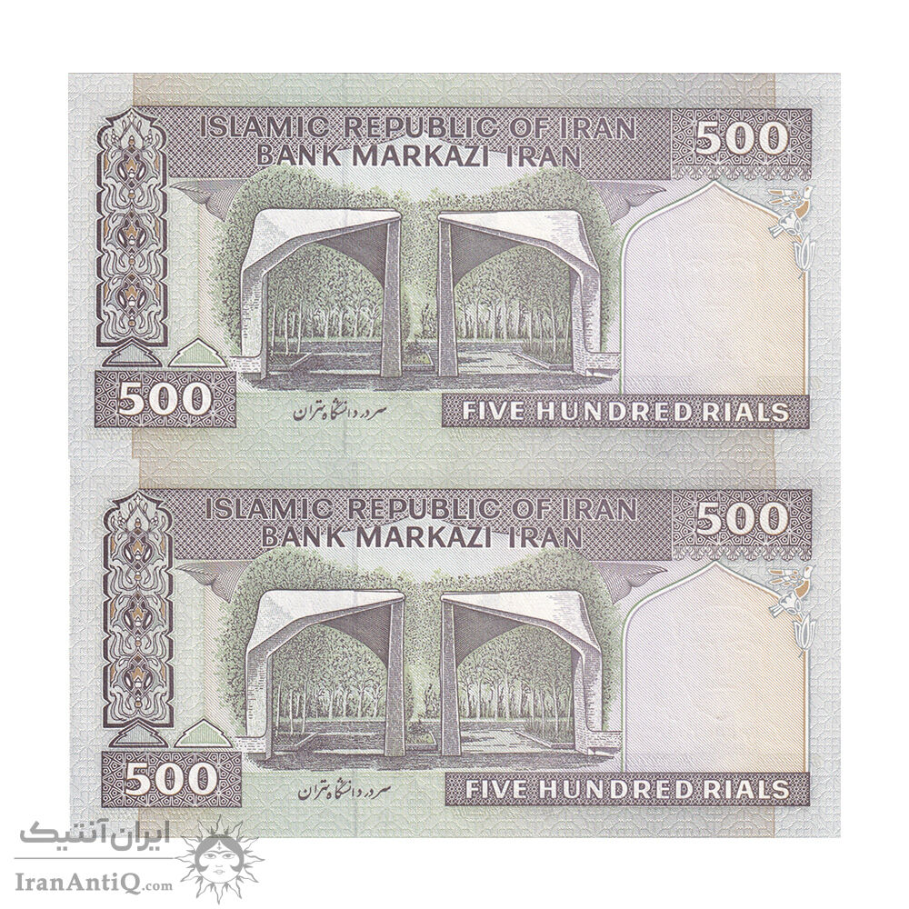 اسکناس 500 ریال (نوربخش - عادلی) امضاء کوچک - شماره بزرگ - جفت - UNC63 - جمهوری اسلامی