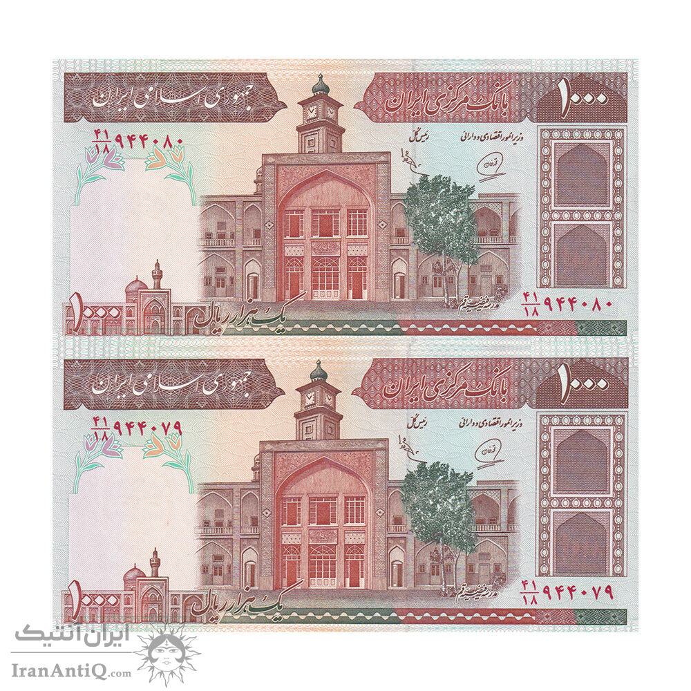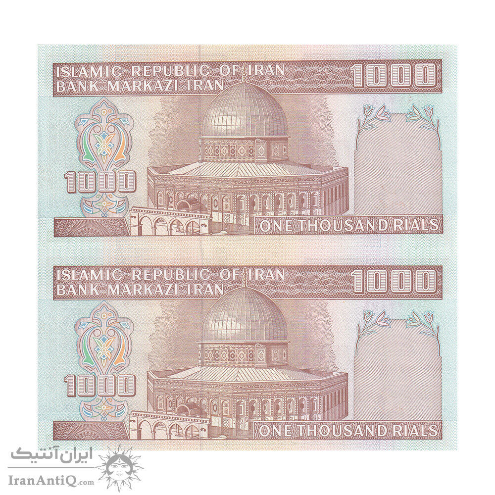 اسکناس 1000 ریال (محمدخان - عادلی) شماره بزرگ - نخ نستعلیق - جفت - UNC63 - جمهوری اسلامی
