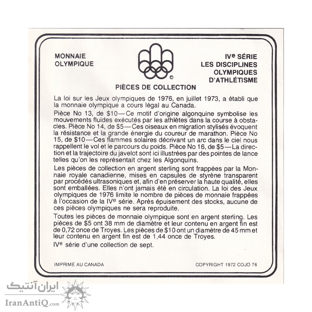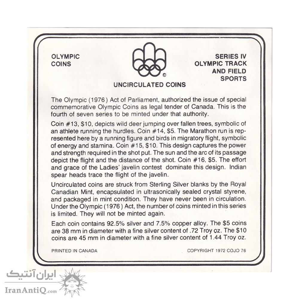 این سری شامل 4 عدد مدال نقره عیار 925 که 2 عدد 10 دلار و 2 عدد 5 دلار کانادا با جعبه و شناسنامه فابریک می باشد که برای یادبود المپیک مونترال سال 1976 ضرب شده است.