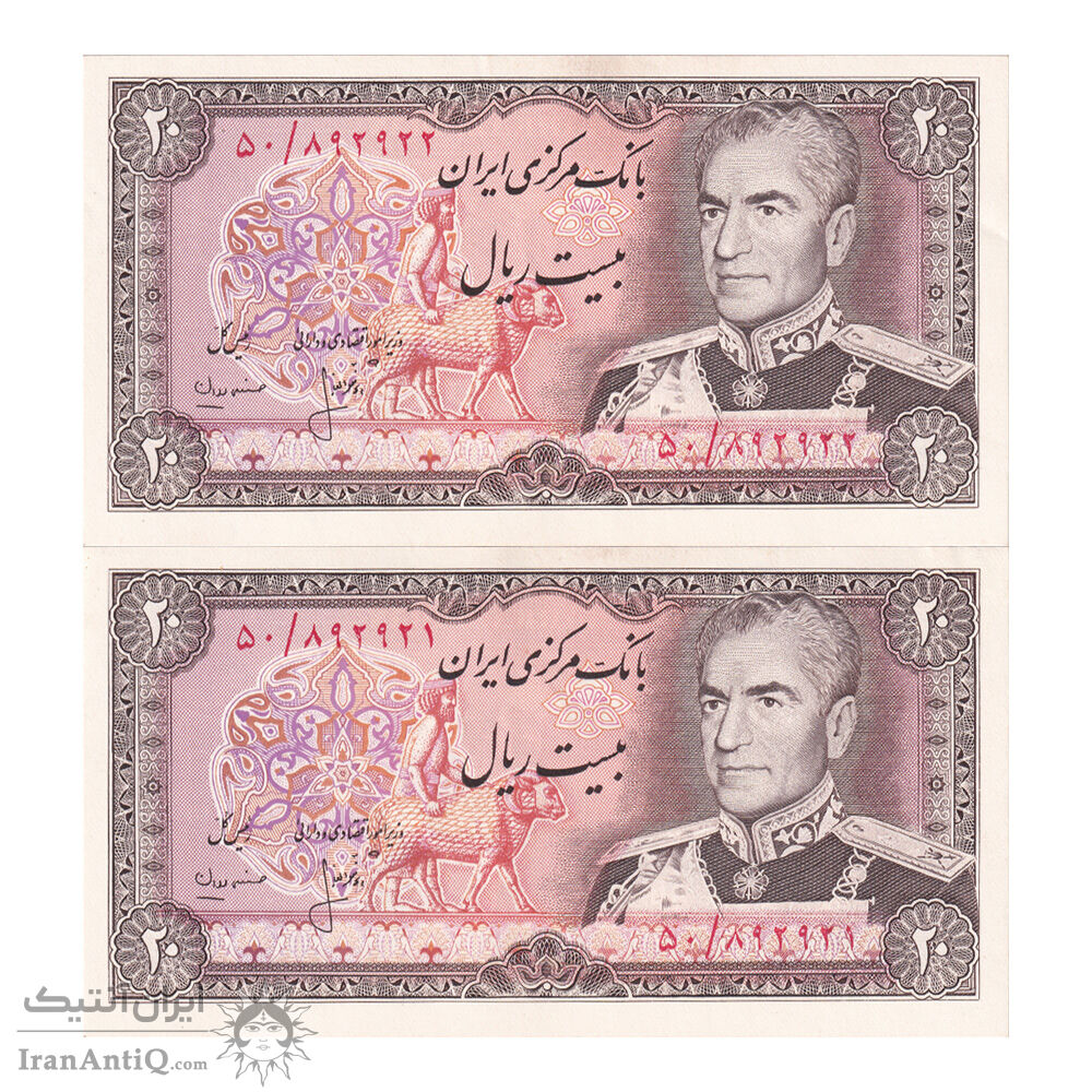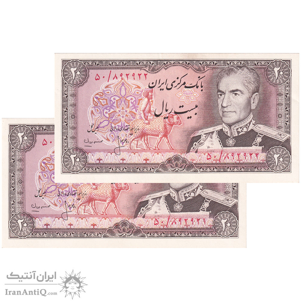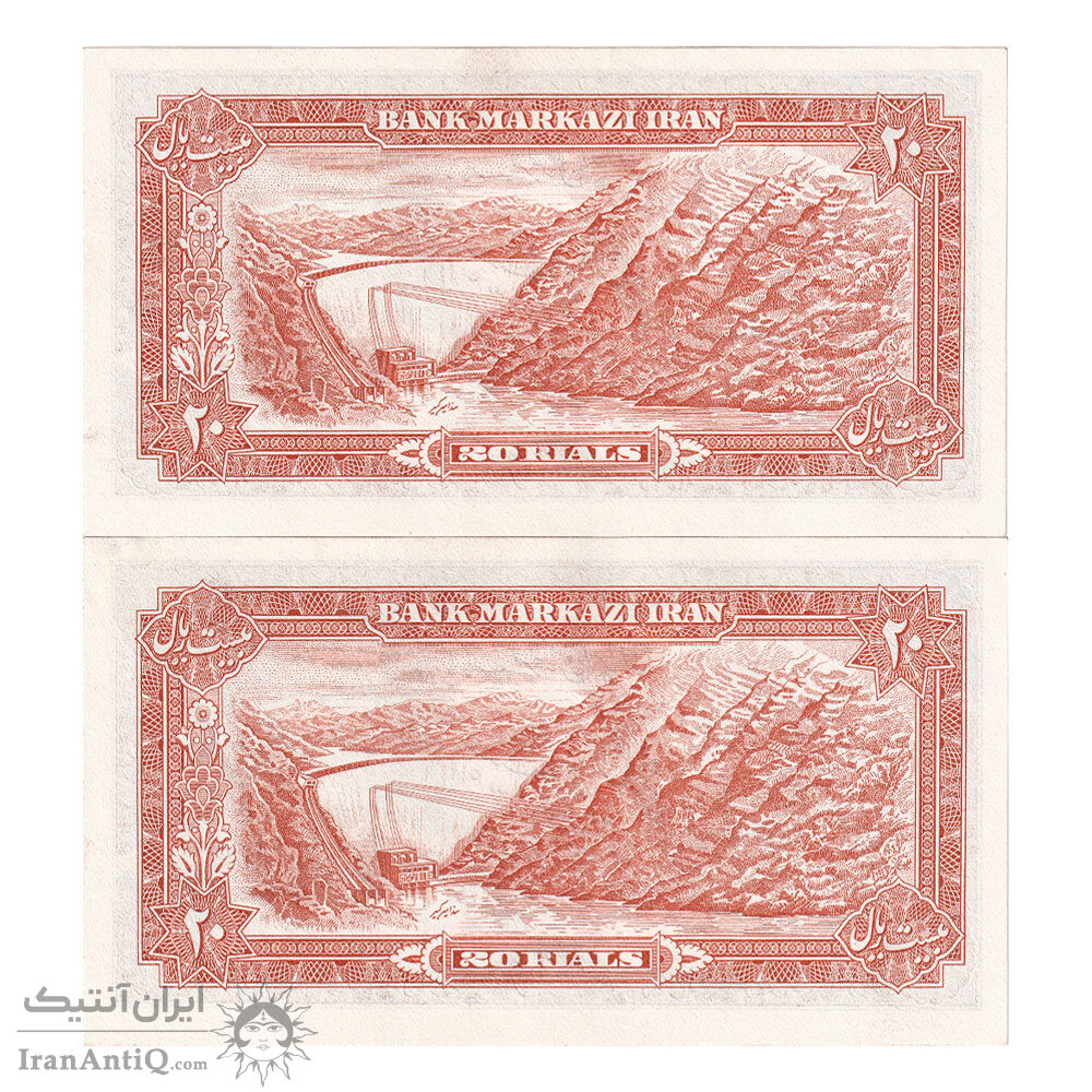 اسکناس 20 ریال (انصاری - مهران) ریال باز - ارور کادر اضافه - جفت - UNC61 - محمد رضا شاه