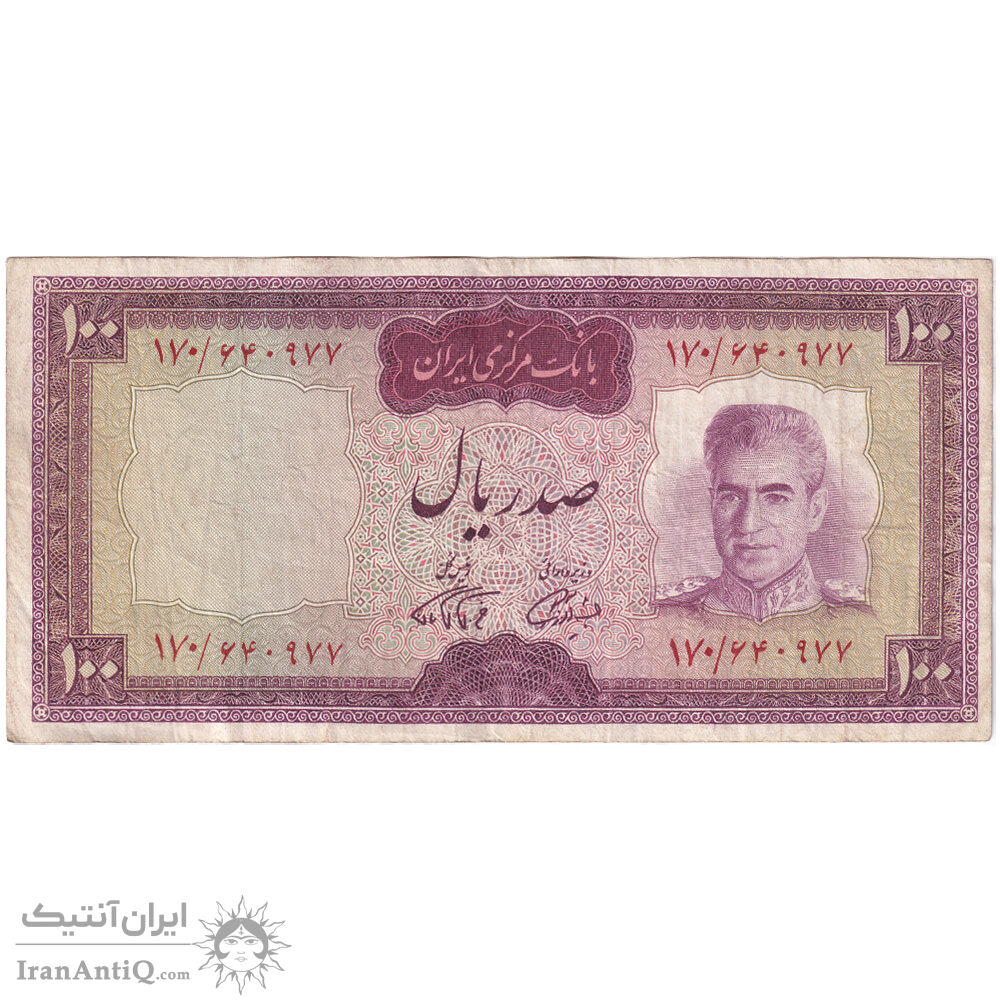 اسکناس 100 ریال (آموزگار - فرمان فرماییان) نوشته قرمز - تک - VF25 - محمد رضا شاه