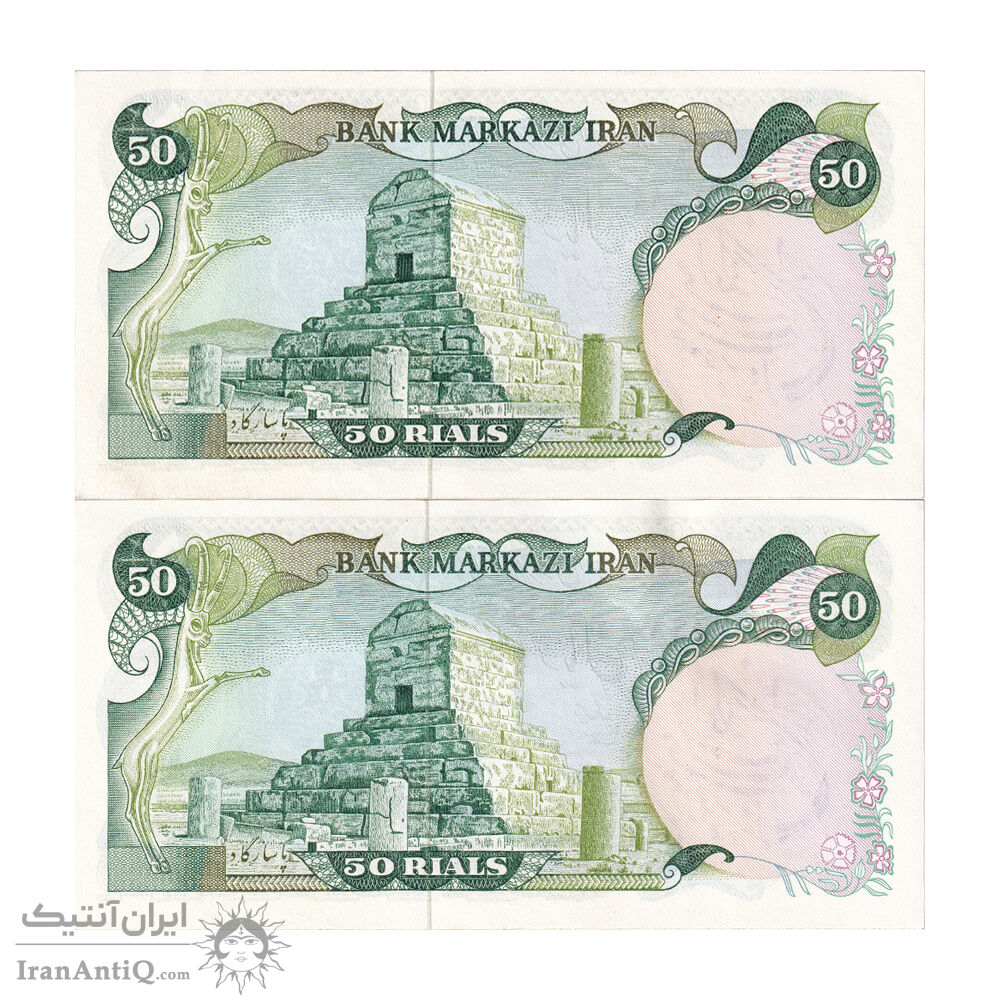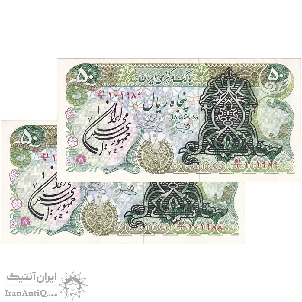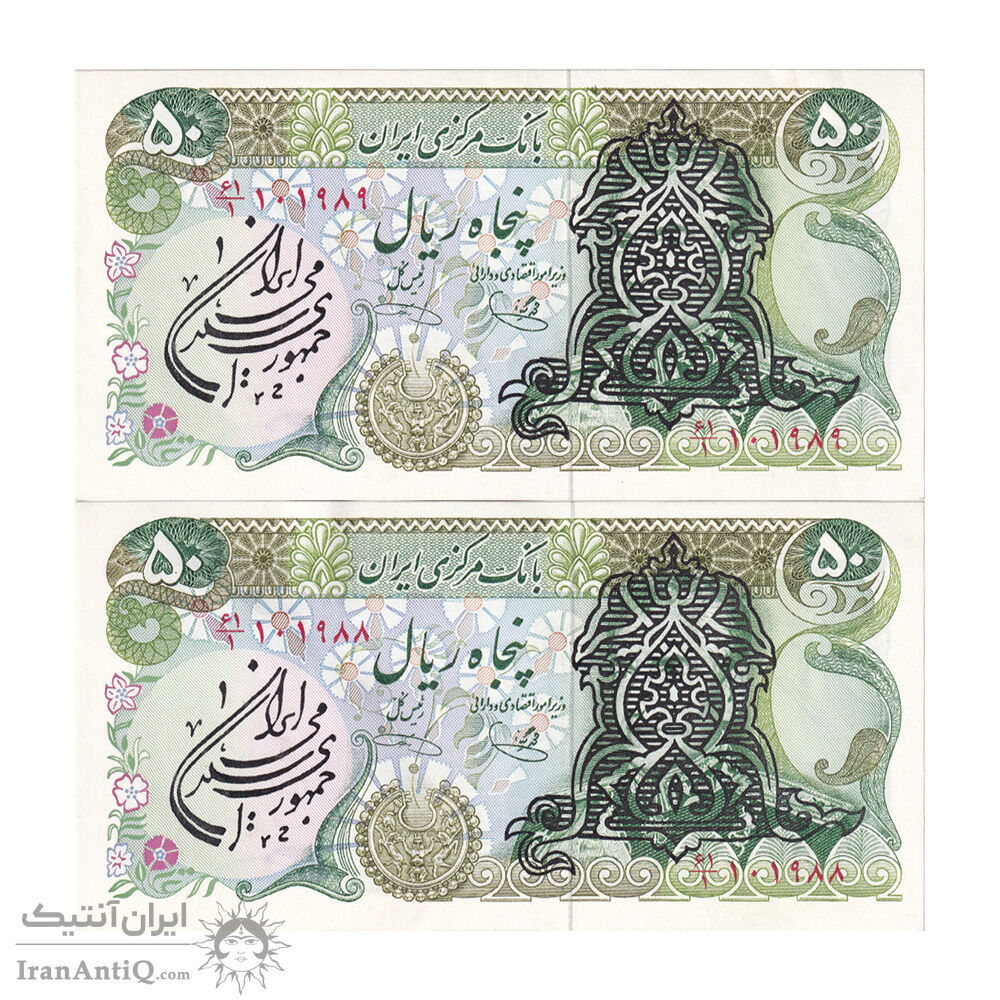 اسکناس 50 ریال سورشارژی (یگانه - خوش کیش) مهر جمهوری - جفت - UNC62 - جمهوری اسلامی