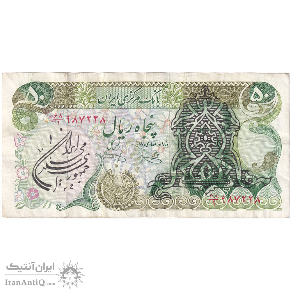 اسکناس 50 ریال سورشارژی (یگانه - خوش کیش) مهر جمهوری - تک - VF35 - جمهوری اسلامی