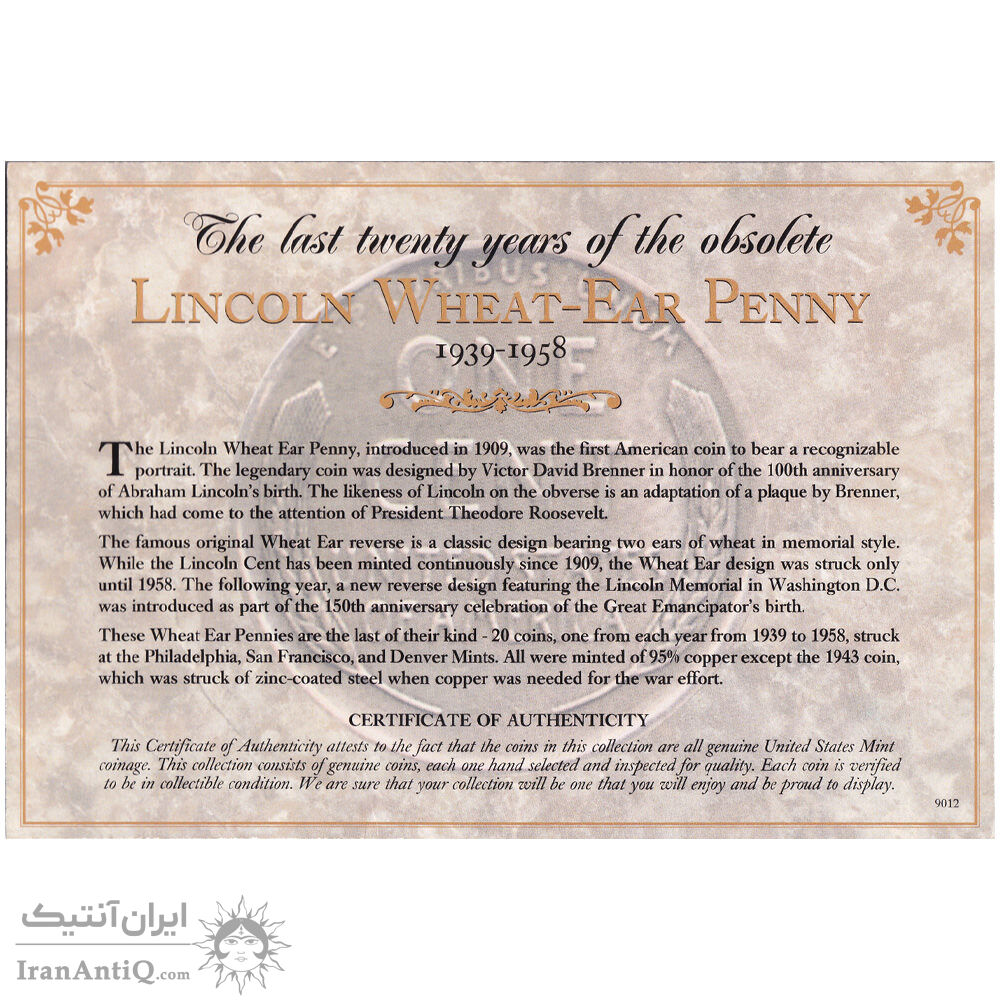 این محصول شامل 20 عدد 1 سنت لینکلن از تاریخ 1939 تا 1958 بوده و همانند تصویر می باشد.