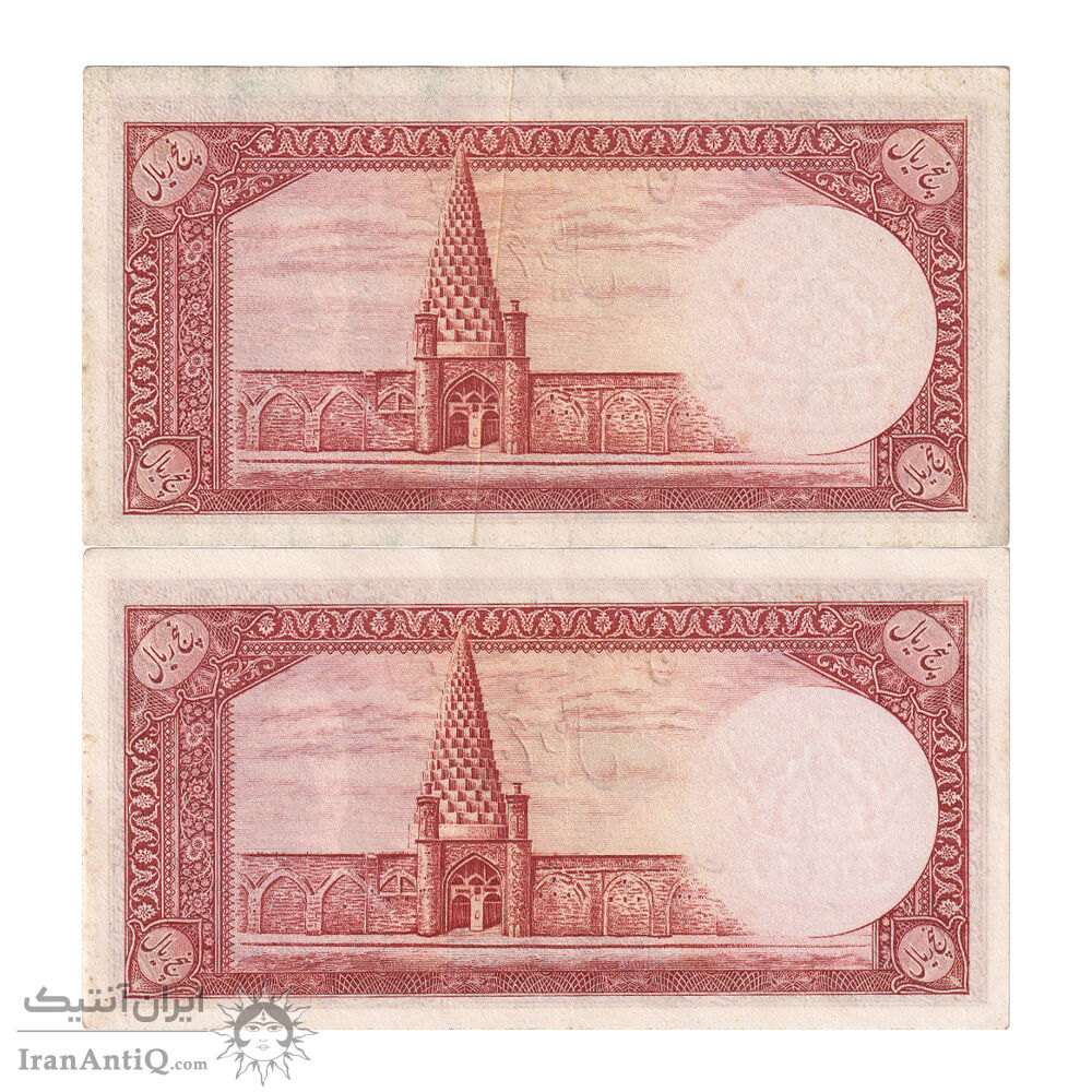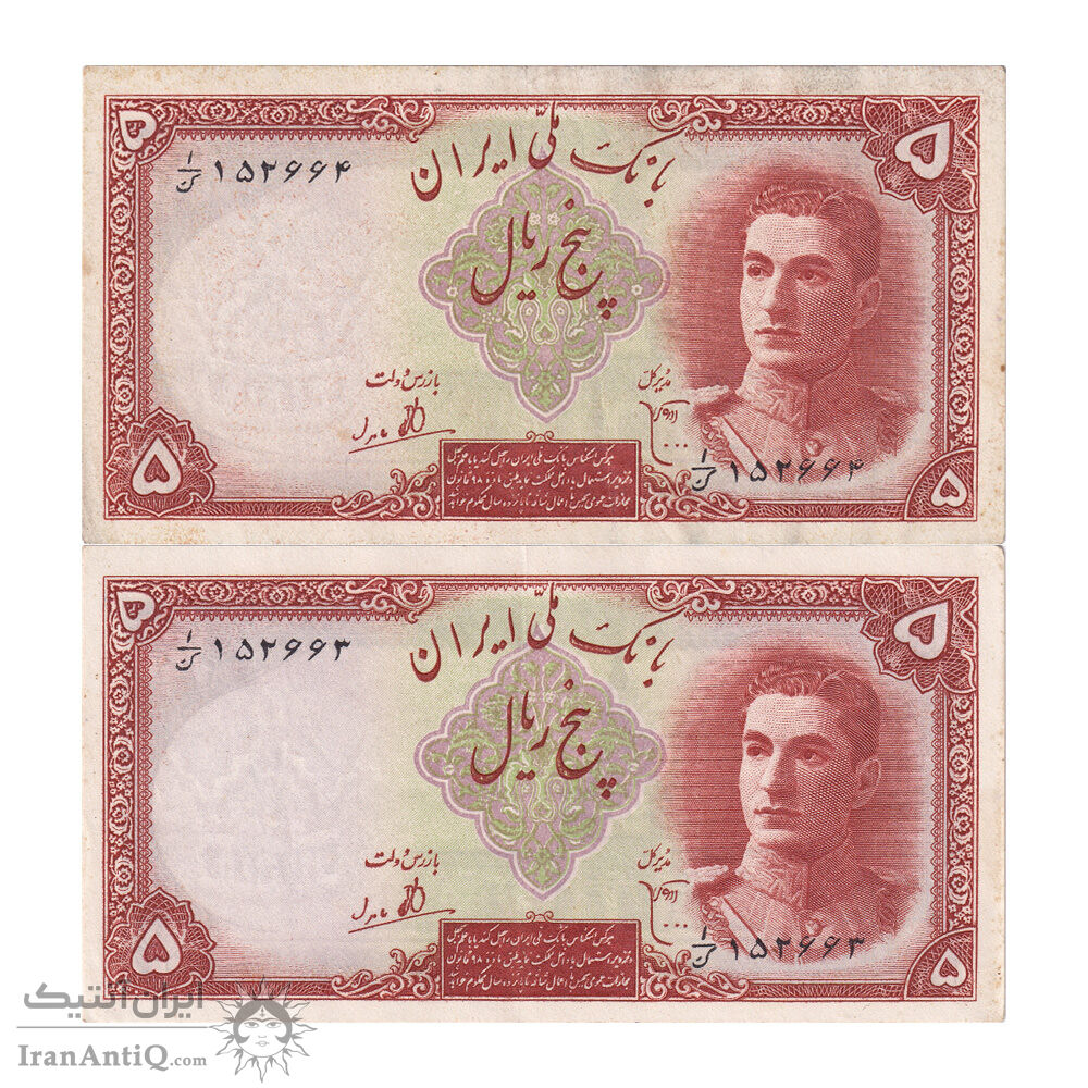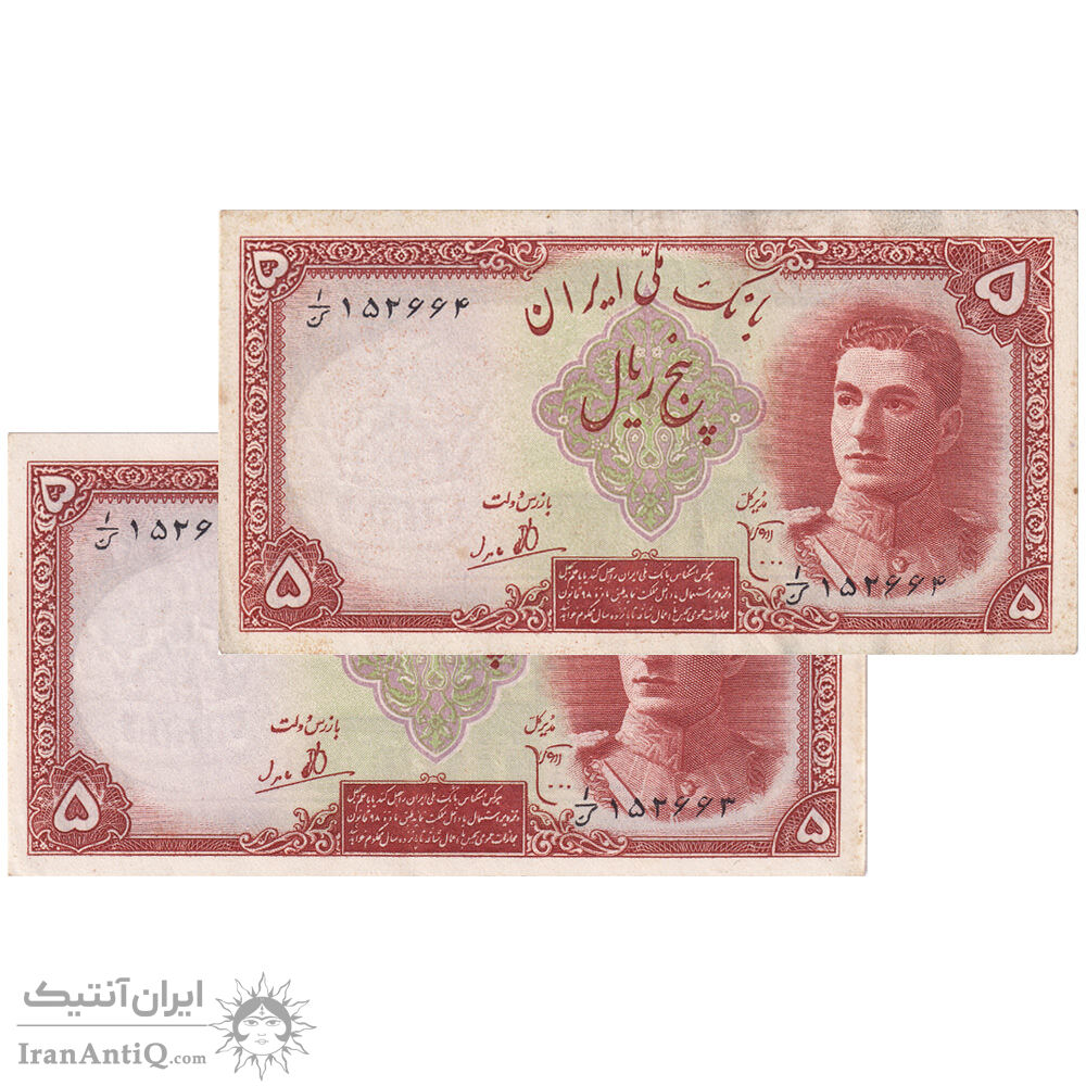 اسکناس 5 ریال - جفت - AU53 - محمد رضا شاه