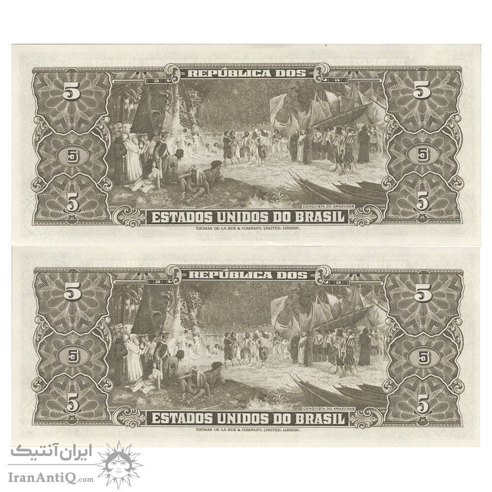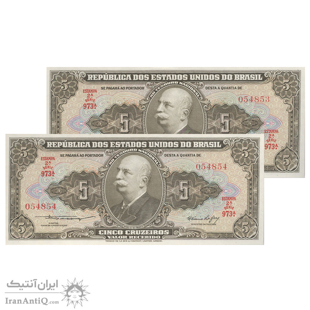 اسکناس 5 کروزریو بدون تاریخ(1953) جمهوری اول - امضای CSL, HL - جفت - AU58 - برزیل