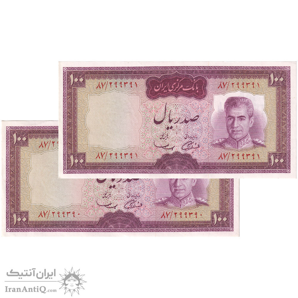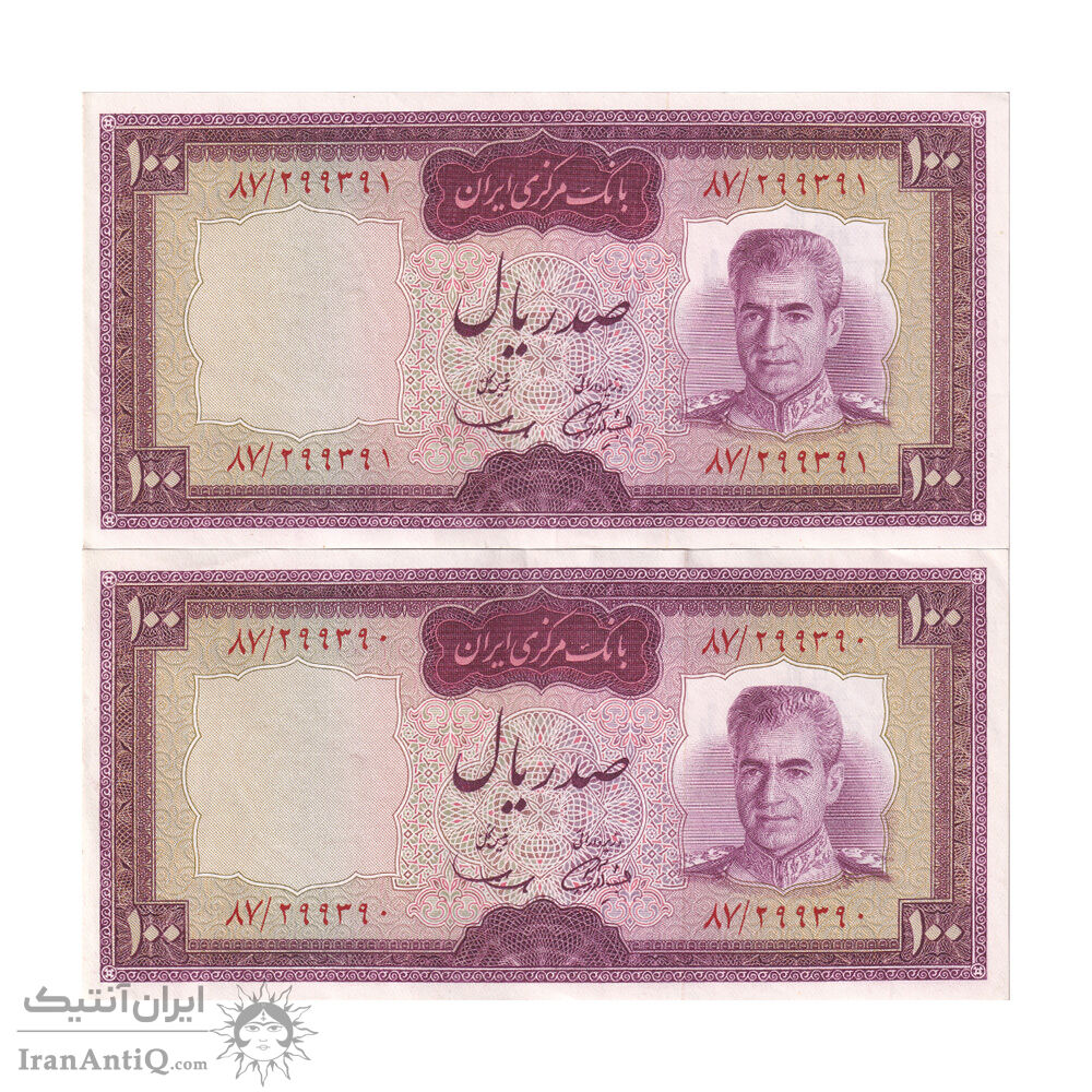 اسکناس 100 ریال (آموزگار - سمیعی) نوشته قرمز - جفت - AU55 - محمد رضا شاه