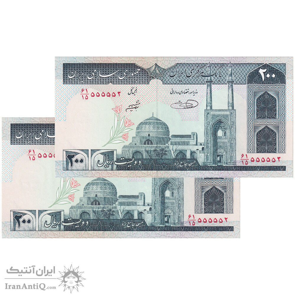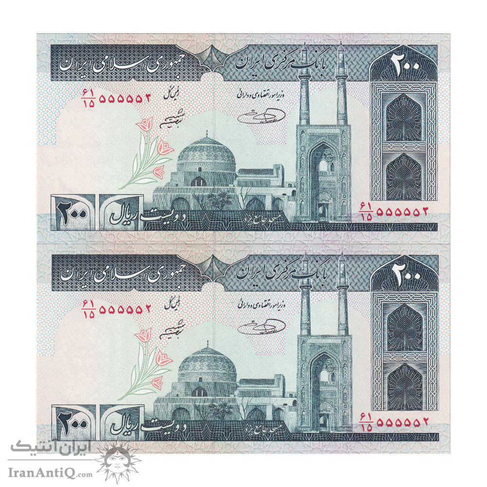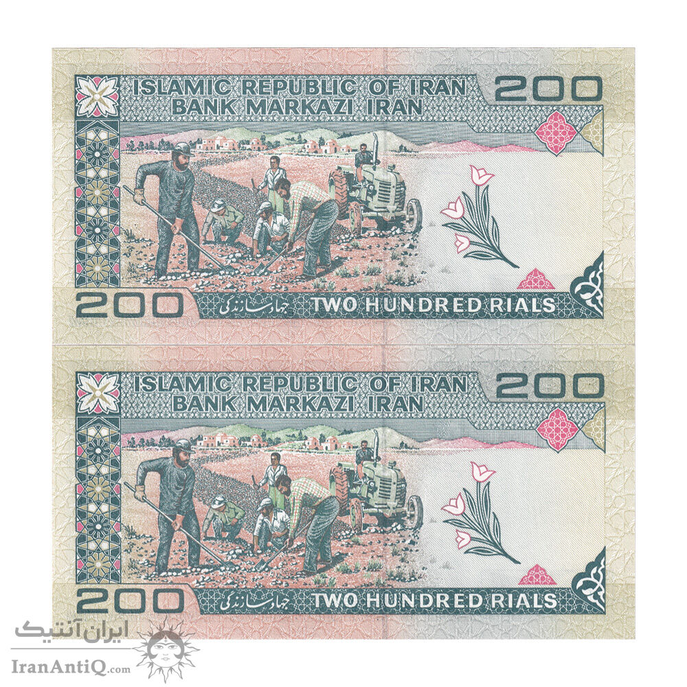 اسکناس 200 ریال (شیبانی - حسینی) - نخ نستعیلق - شماره نیمه رند - جفت - UNC64 - جمهوری اسلامی