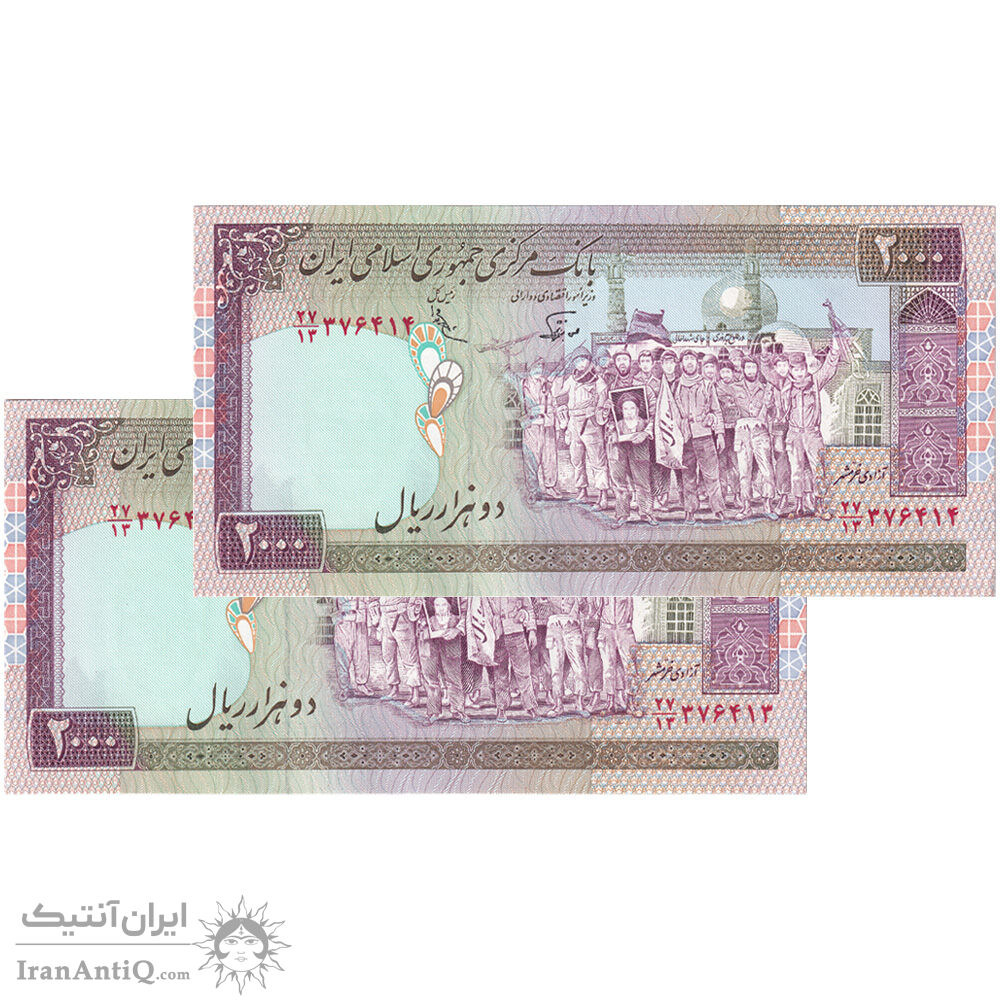 اسکناس 2000 ریال (نوربخش - عادلی) امضاء کوچک - شماره بزرگ - جفت - UNC62 - جمهوری اسلامی