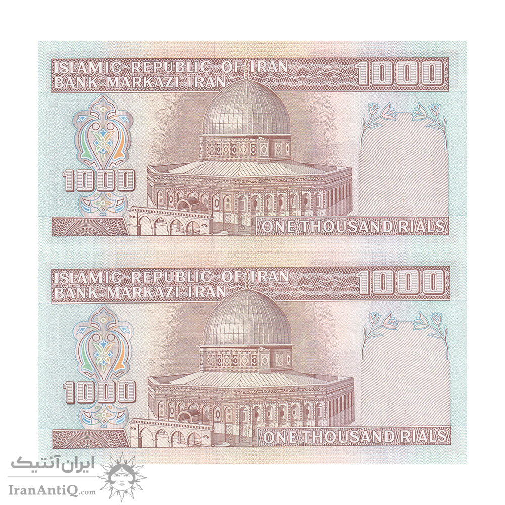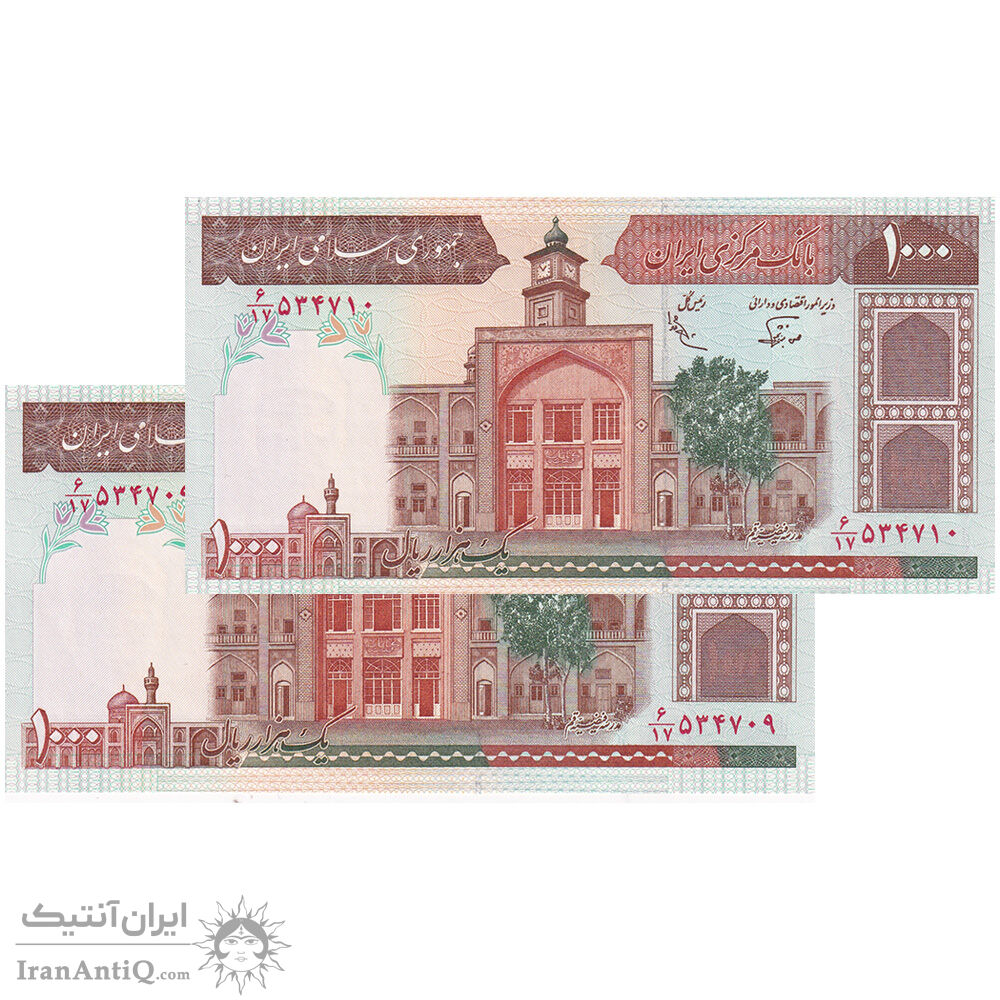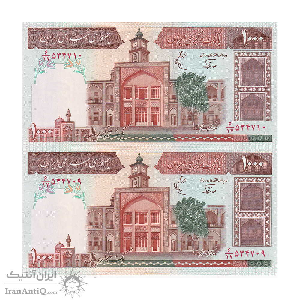 اسکناس 1000 ریال (نوربخش - عادلی) امضاء کوچک - شماره بزرگ - جفت - UNC64 - جمهوری اسلامی