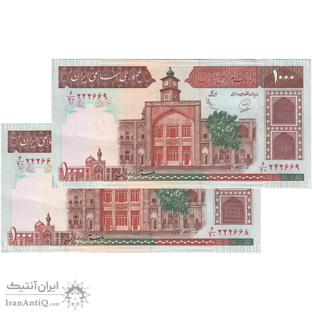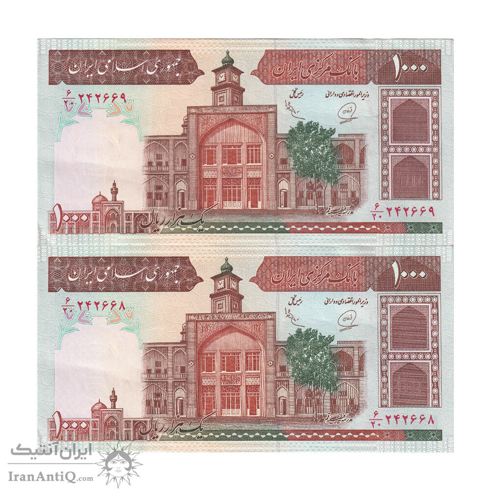 اسکناس 1000 ریال (محمدخان - عادلی) شماره بزرگ - نخ کامپیوتری - جفت - AU53 - جمهوری اسلامی