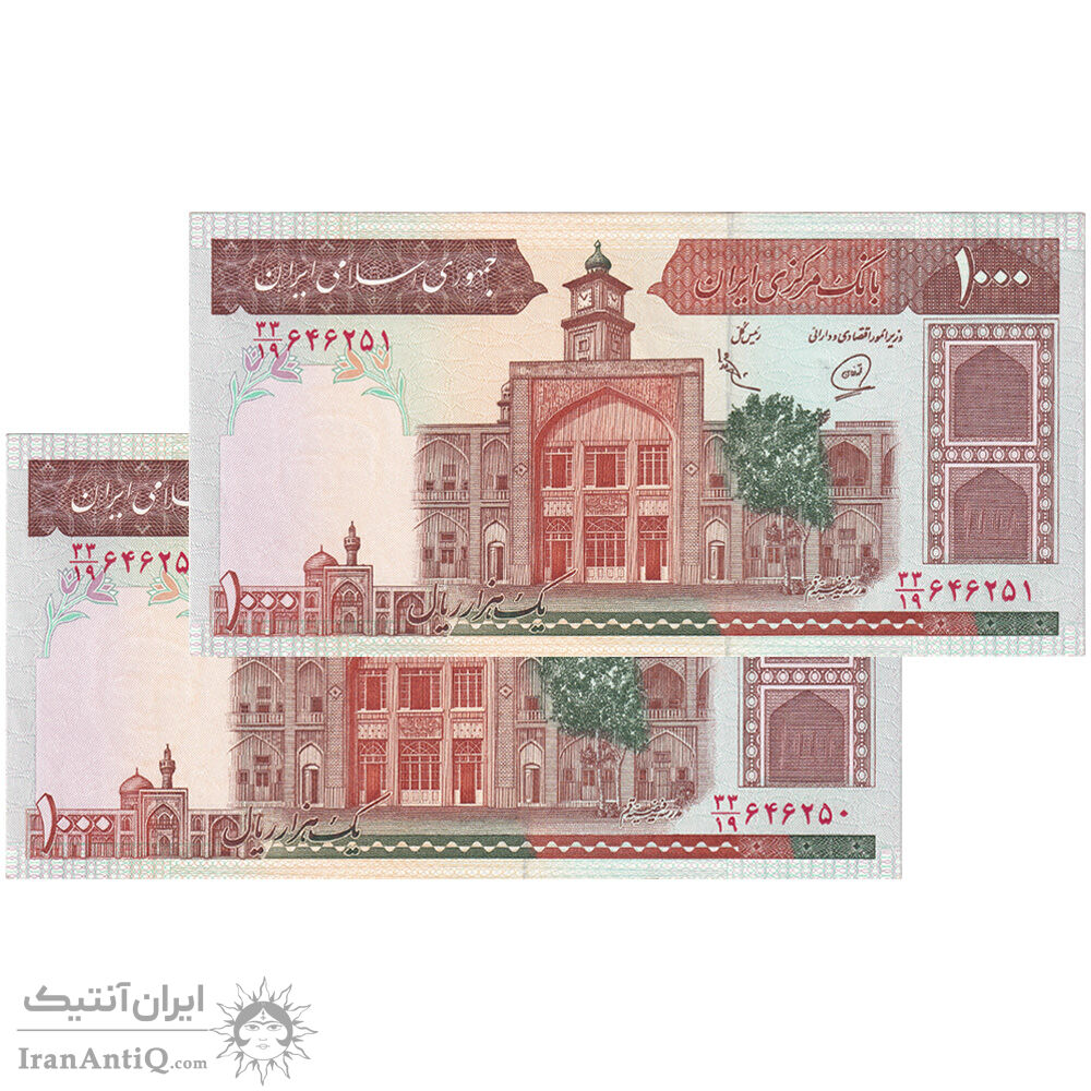 اسکناس 1000 ریال (محمدخان - عادلی) شماره بزرگ - نخ نستعلیق - جفت - UNC60 - جمهوری اسلامی
