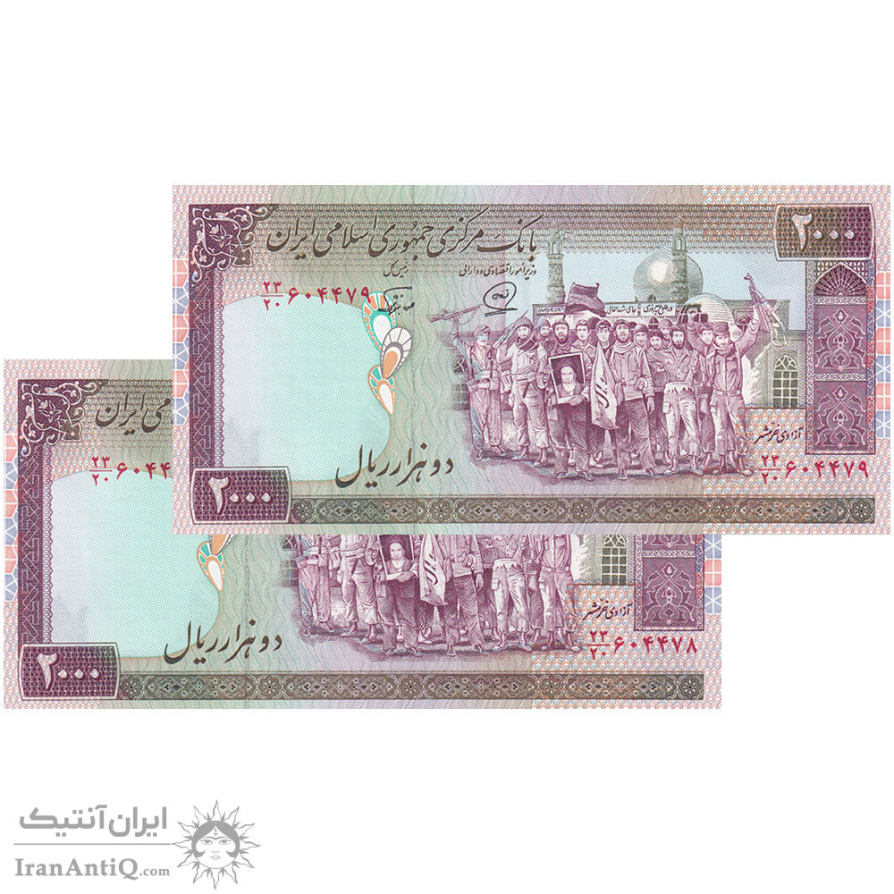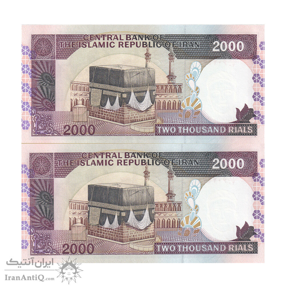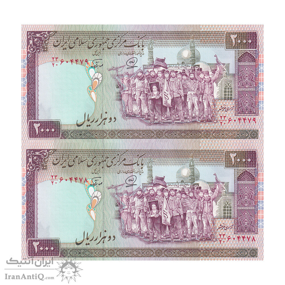 اسکناس 2000 ریال (محمدخان - نوربخش) شماره بزرگ - نخ نستعلیق - جفت - UNC64 - جمهوری اسلامی