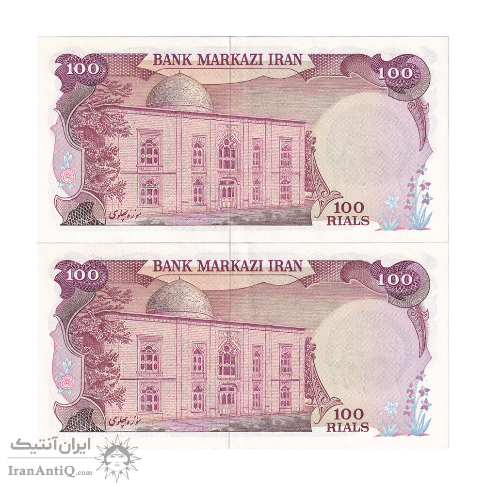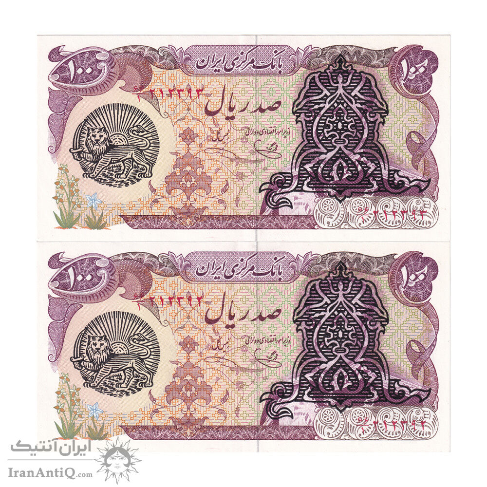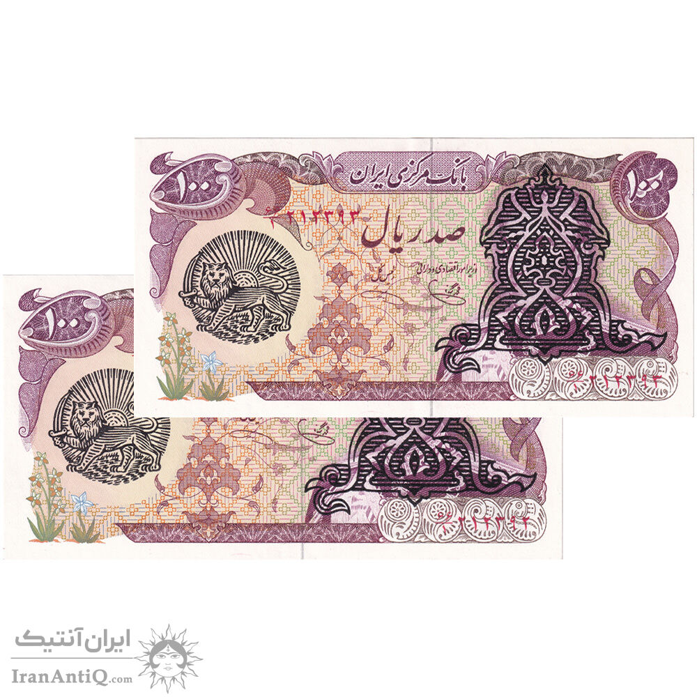 اسکناس 100 ریال سورشارژی (یگانه - خوش کیش) مهر شیر و خورشید - جفت - AU58 - جمهوری اسلامی