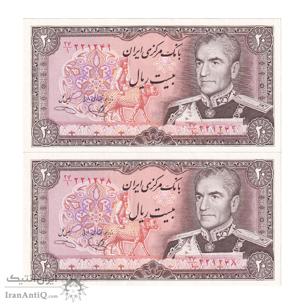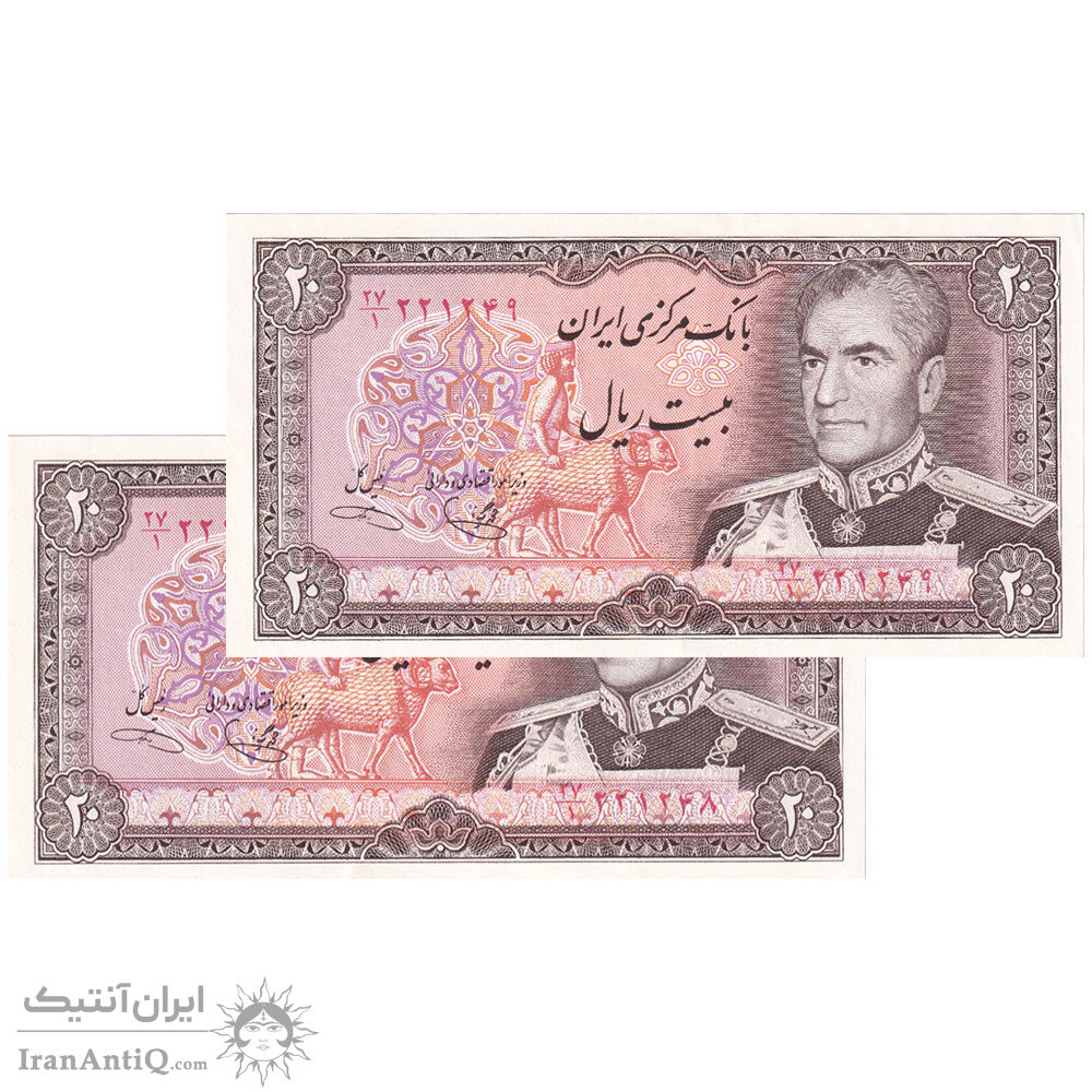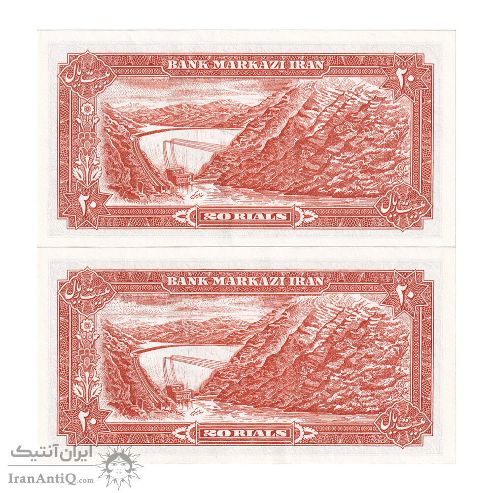 اسکناس 20 ریال (یگانه - خوش کیش) - جفت - AU58 - محمد رضا شاه