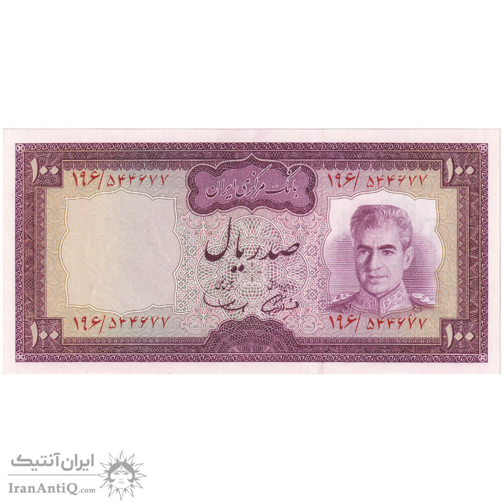 اسکناس 100 ریال (آموزگار - سمیعی) نوشته سیاه - تک - UNC64 - محمد رضا شاه