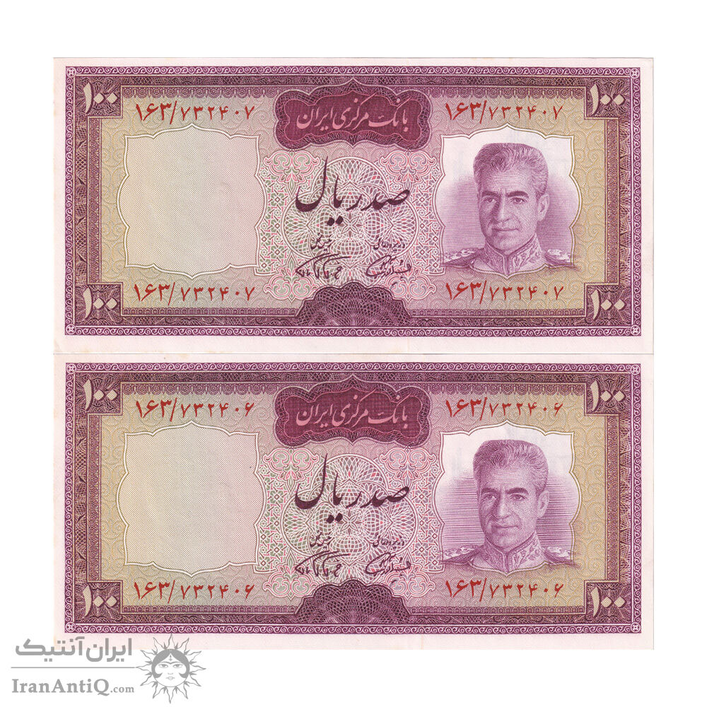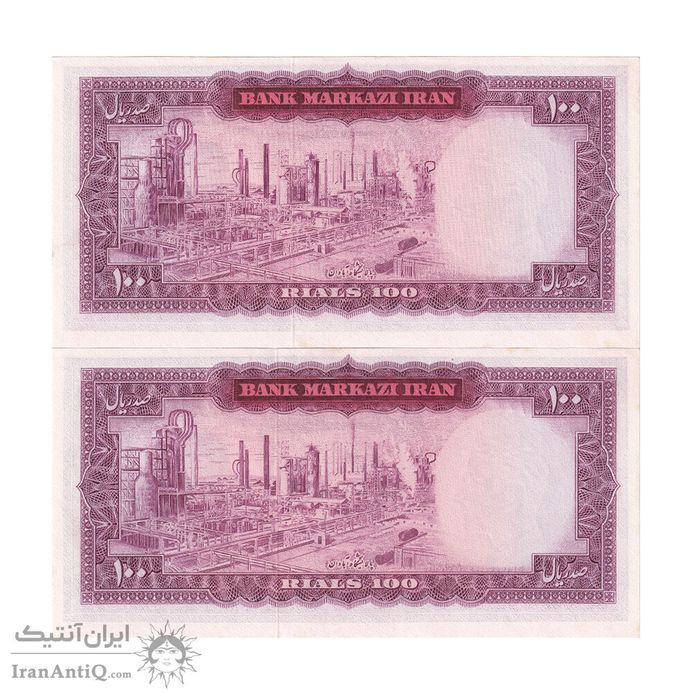 اسکناس 100 ریال (آموزگار - فرمان فرماییان) نوشته قرمز - جفت - UNC62 - محمد رضا شاه