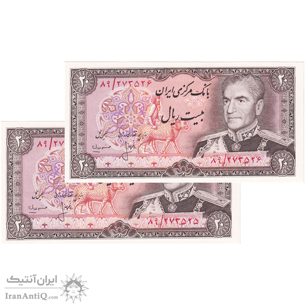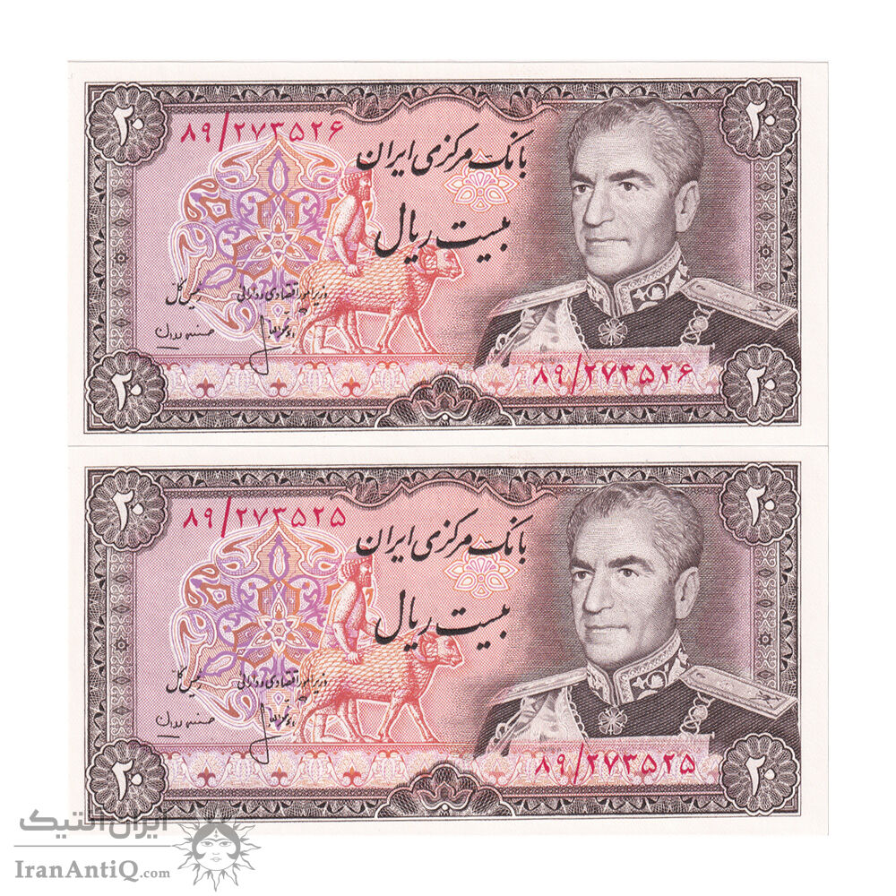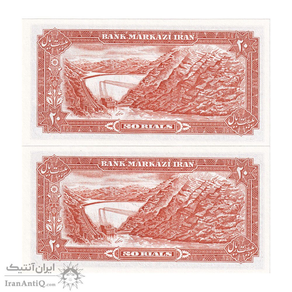 اسکناس 20 ریال (انصاری - مهران) ریال باز - جفت - UNC64 - محمد رضا شاه
