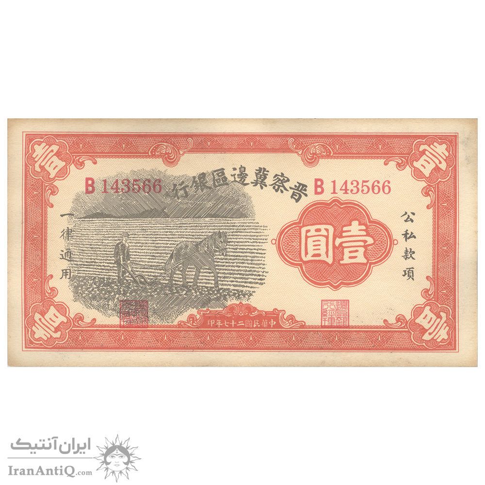 اسکناس 1 یوآن 1938 منطقه آزاد شده هوپه-جهول-لیائونینگ - تک - UNC62 - چین