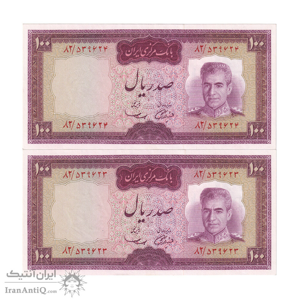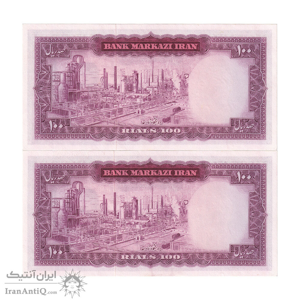 اسکناس 100 ریال (آموزگار - سمیعی) نوشته قرمز - جفت - UNC62 - محمد رضا شاه