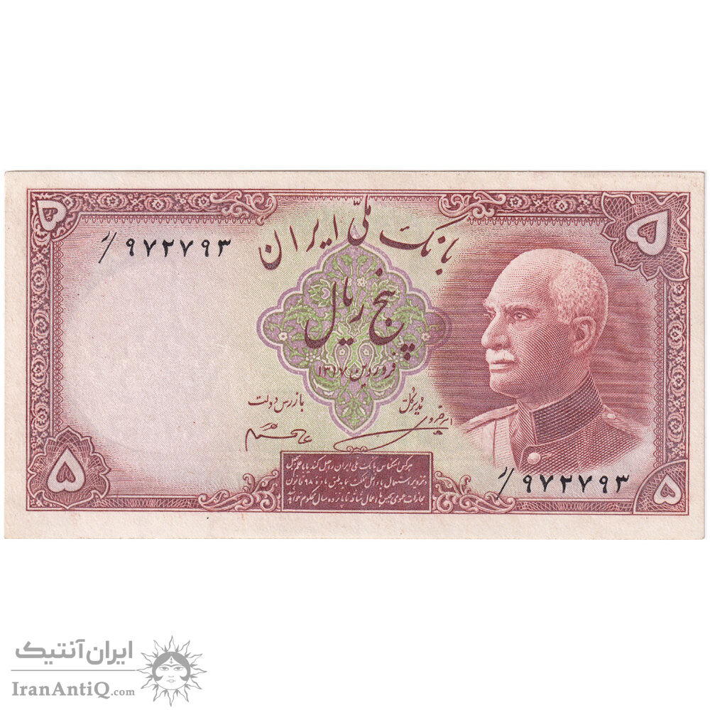 اسکناس 5 ریال پشت فارسی - بدون مهر - تک - UNC61 - رضا شاه