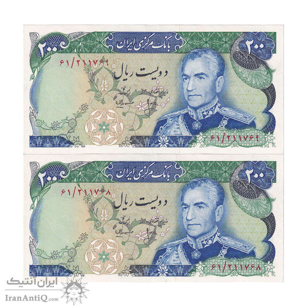 اسکناس 200 ریال میدان شهیاد (انصاری - مهران) - جفت - AU58 - محمد رضا شاه