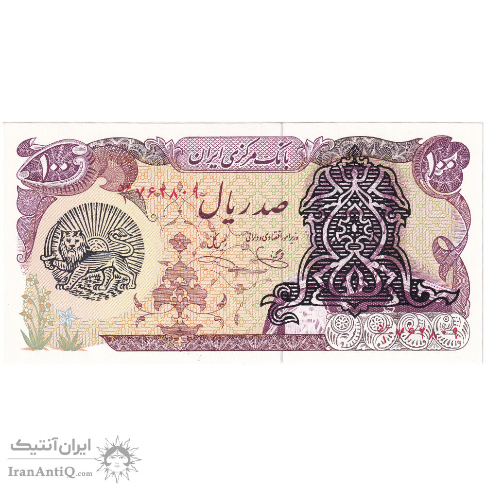 اسکناس 100 ریال سورشارژی (یگانه - خوش کیش) مهر شیر و خورشید - تک - UNC63 - جمهوری اسلامی