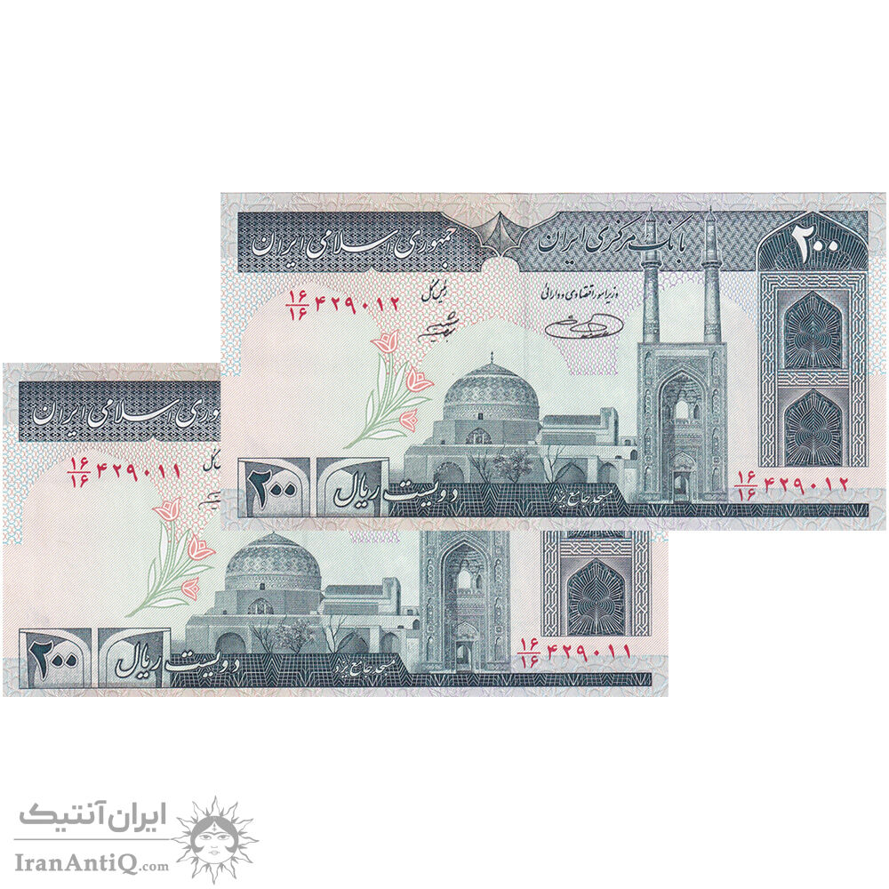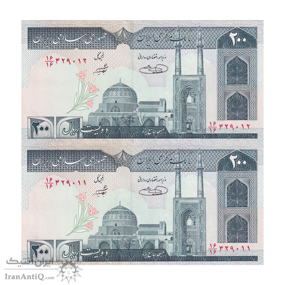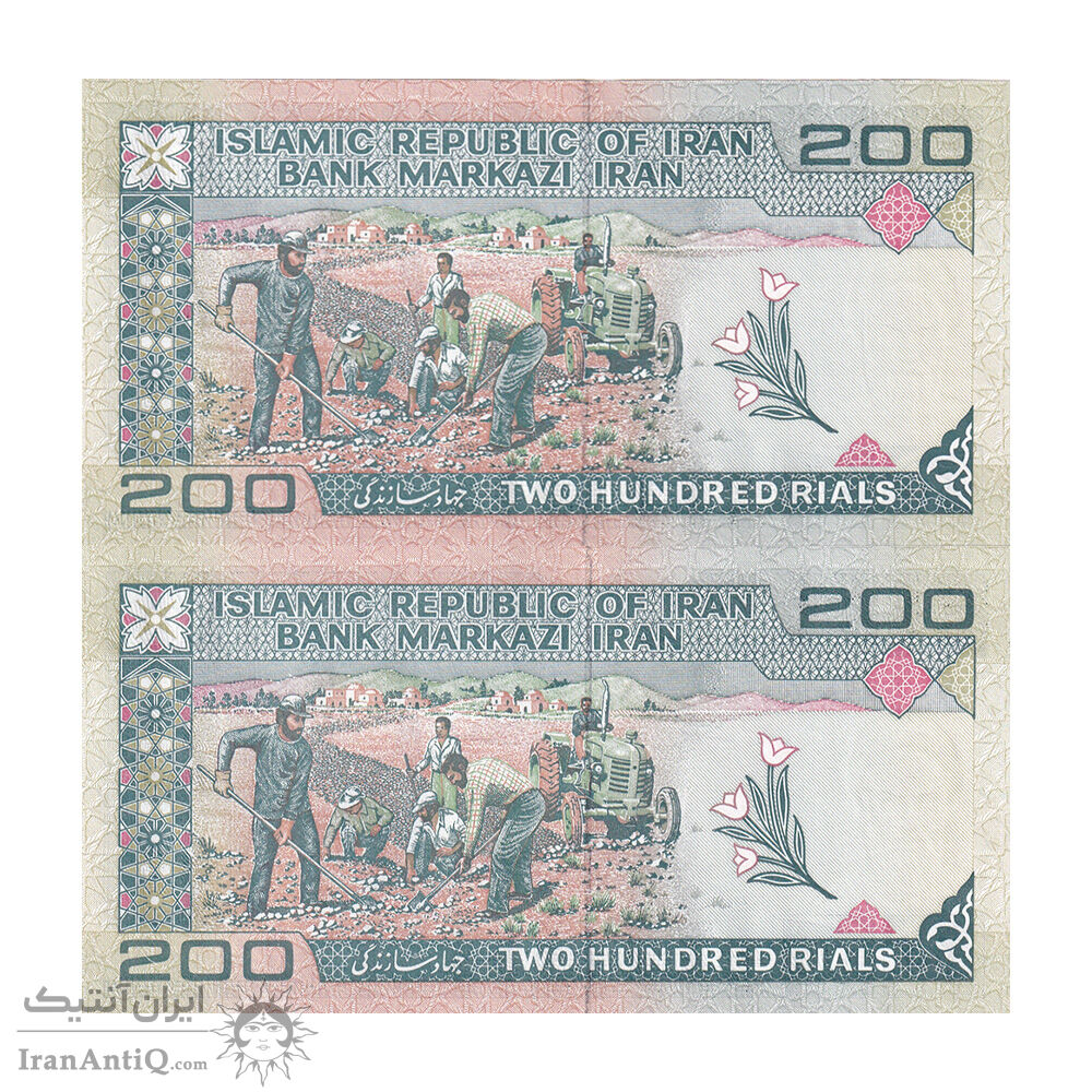 اسکناس 200 ریال (شیبانی - حسینی) - نخ نستعیلق - کسر یکسان - جفت - UNC64 - جمهوری اسلامی