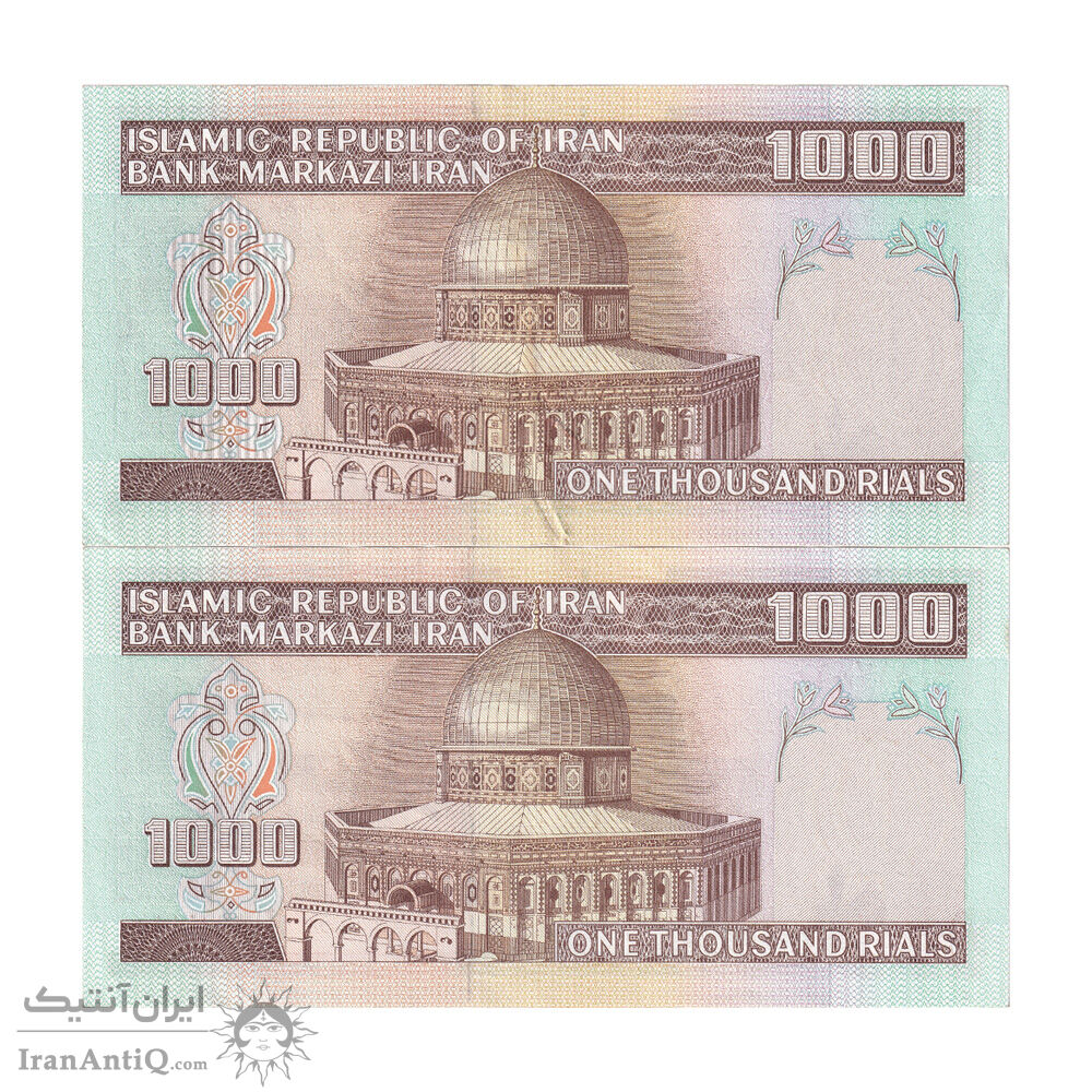 اسکناس 1000 ریال (ایروانی - قاسمی) فیلیگران الله - شماره بزرگ - جفت - AU50 - جمهوری اسلامی