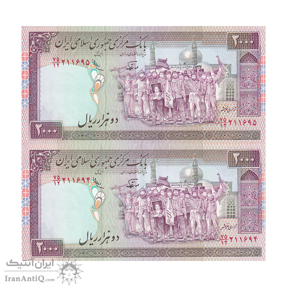 اسکناس 2000 ریال (نوربخش - عادلی) امضاء کوچک - شماره بزرگ - جفت - AU55 - جمهوری اسلامی