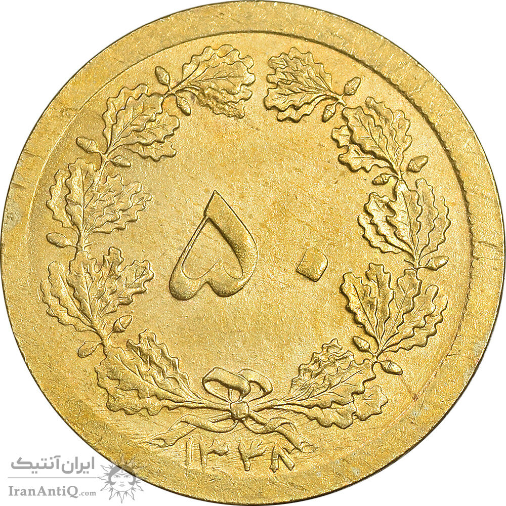 iran 50 dinar 1348 bronze coin - rotate 180 degree - MS63 - mohammad reza shah