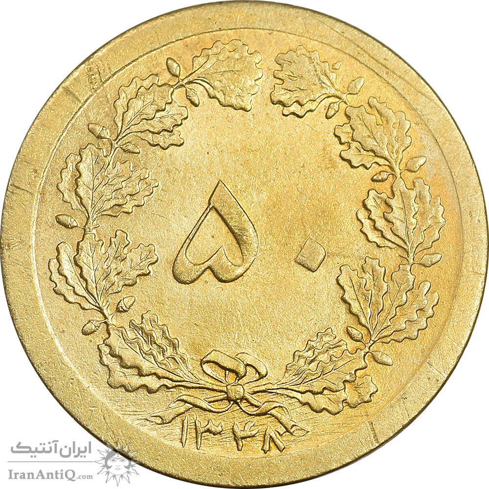 سکه 50 دینار 1348 برنز - چرخش 180 درجه - MS63 - محمد رضا شاه