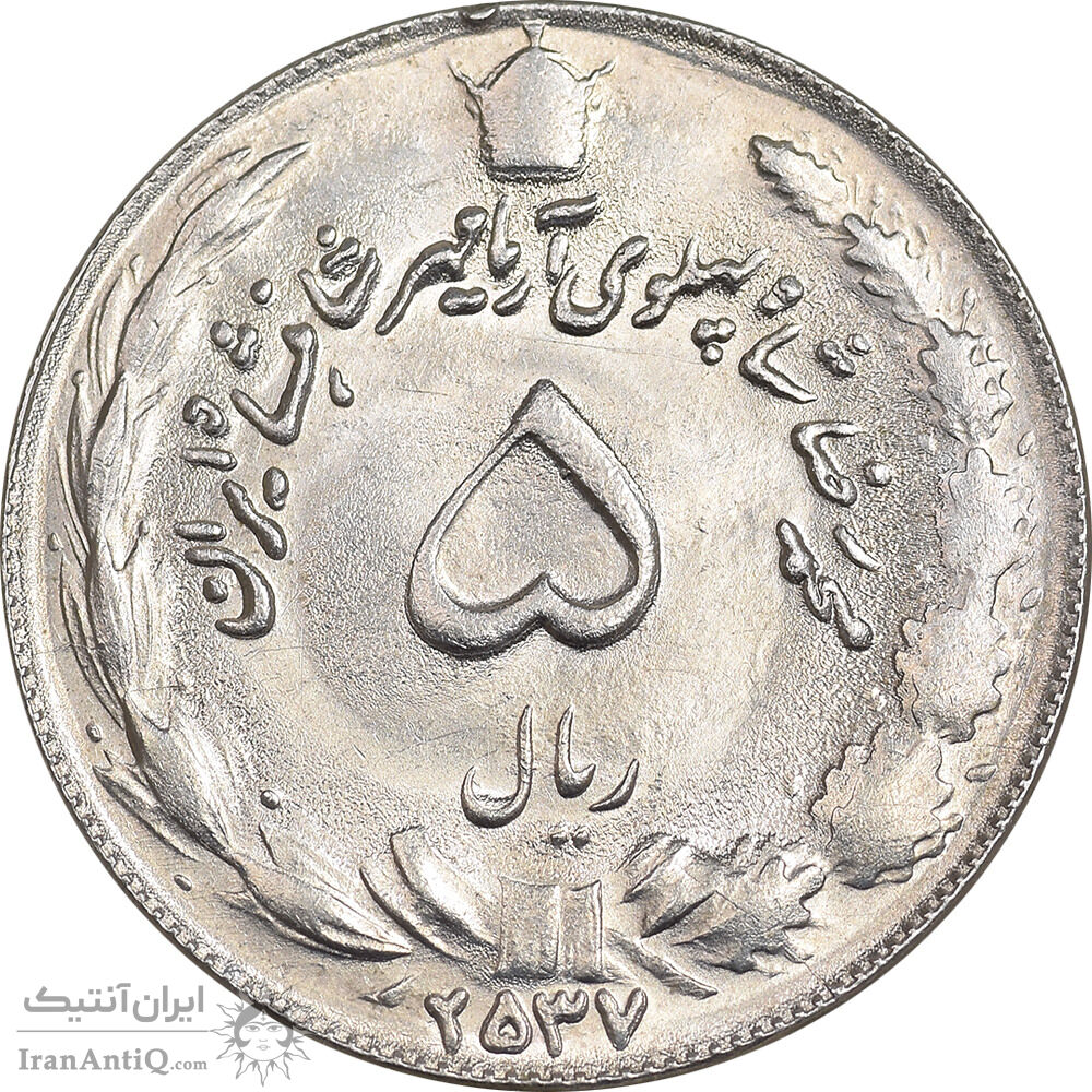 سکه 5 ریال 2537 آریامهر - MS62 - محمد رضا شاه