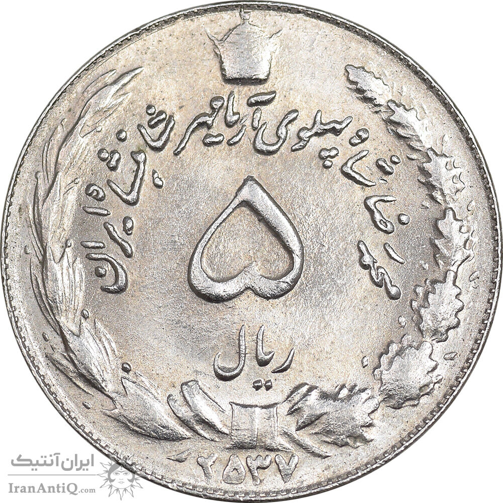 سکه 5 ریال 2537 آریامهر - چرخش 100 درجه - MS62 - محمد رضا شاه