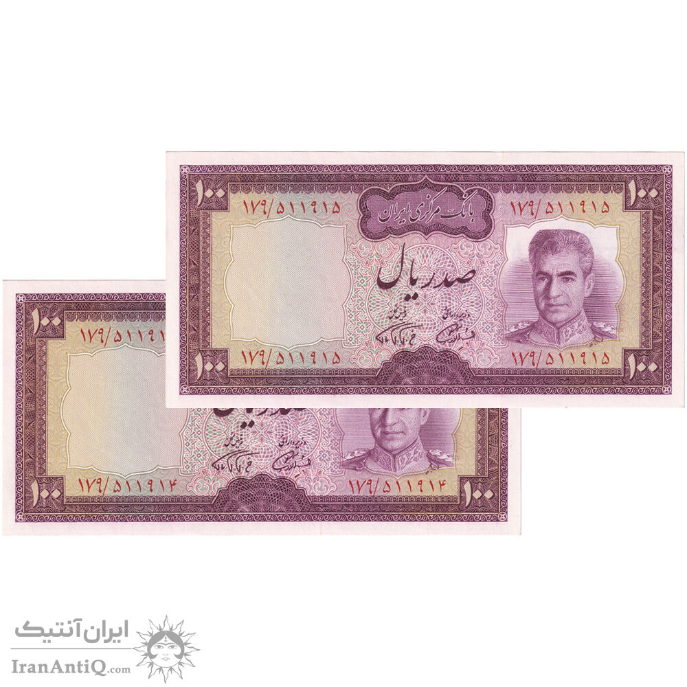اسکناس 100 ریال (آموزگار - فرمان فرماییان) نوشته سیاه - جفت - UNC64 - محمد رضا شاه