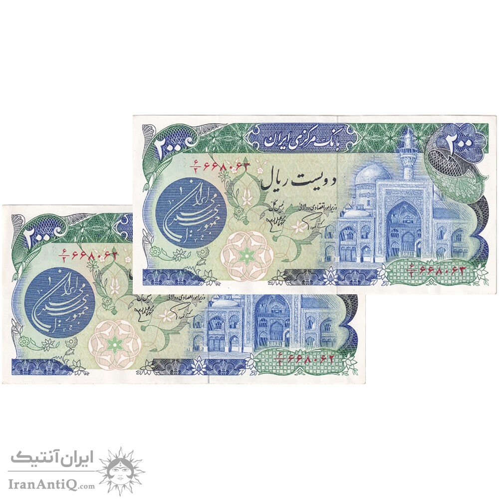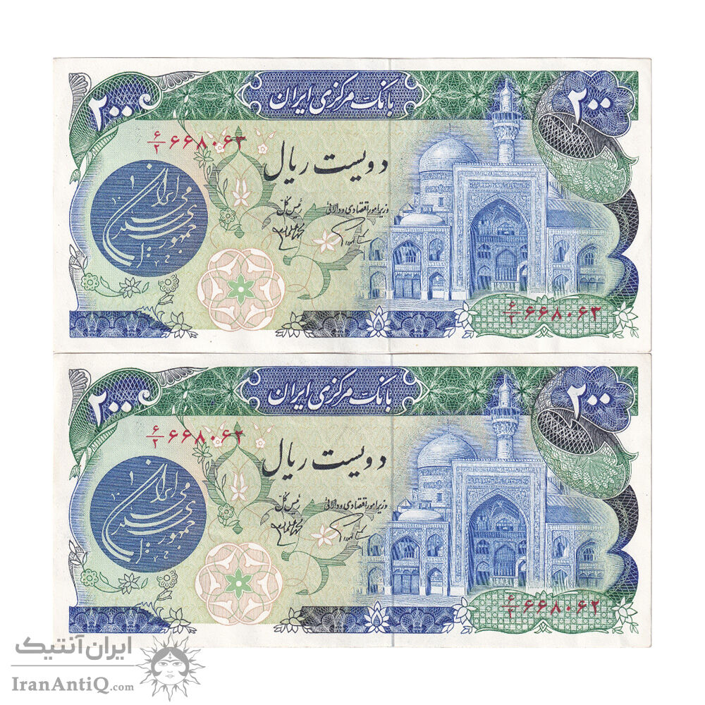 اسکناس 200 ریال (اردلان - مولوی) فیلیگران شیر و خورشید - جفت - AU50 - جمهوری اسلامی