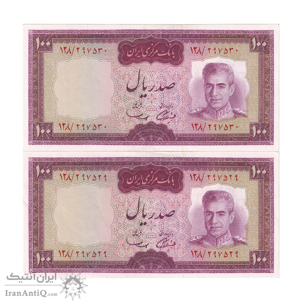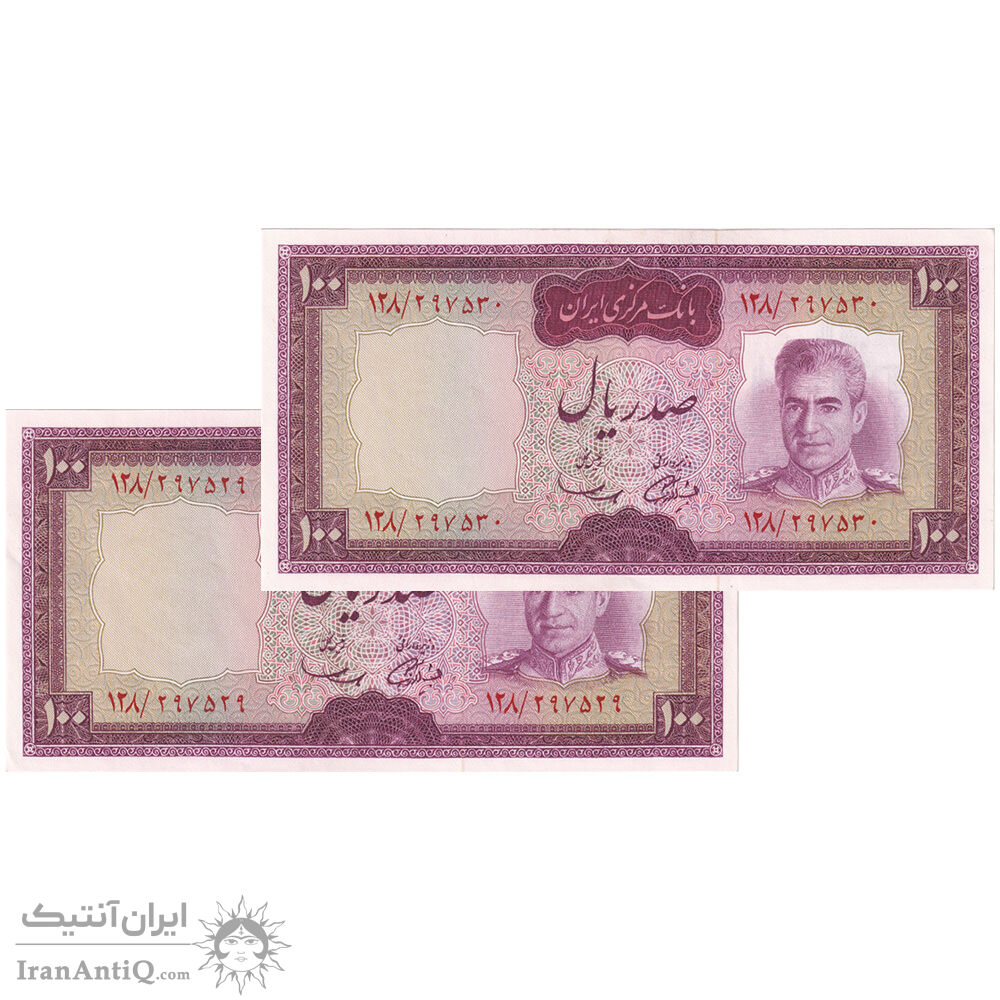 اسکناس 100 ریال (آموزگار - سمیعی) نوشته قرمز - جفت - UNC62 - محمد رضا شاه